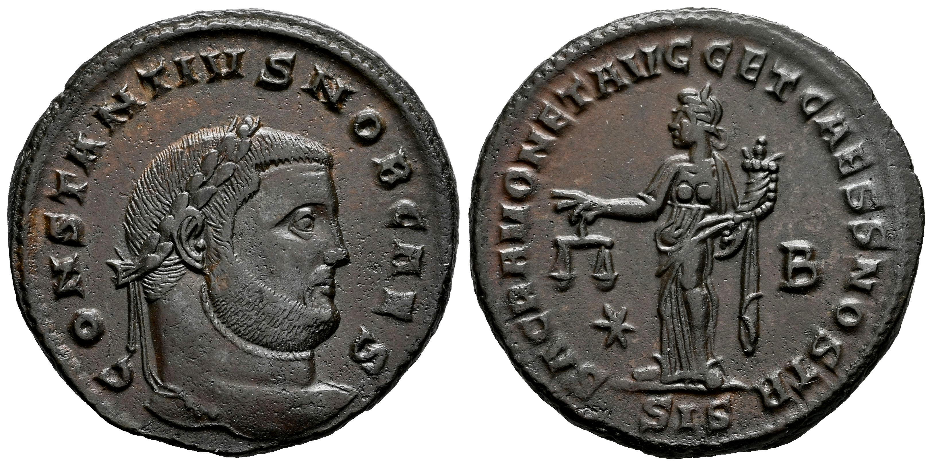 Constantius I Chlorus. Follis. 301 AD. Siscia. (Ric-VI 135a). (Tesorillo-C. Cloro 10, Plate Coin). Anv.: CONSTANTIVS NOB CAES, laureate head to right. Rev.: SACRA MONET AVGG ET CAESS NOSTR, Moneta standing to left, holding scales and cornucopiae; star in left field, B in right field, SIS in exergue. Ae. 9,74 g. Attractive brown patina. Ex Classical Numismatic Goup 232 (28/04/2010), lot 511. Almost XF. Est...90,00.
