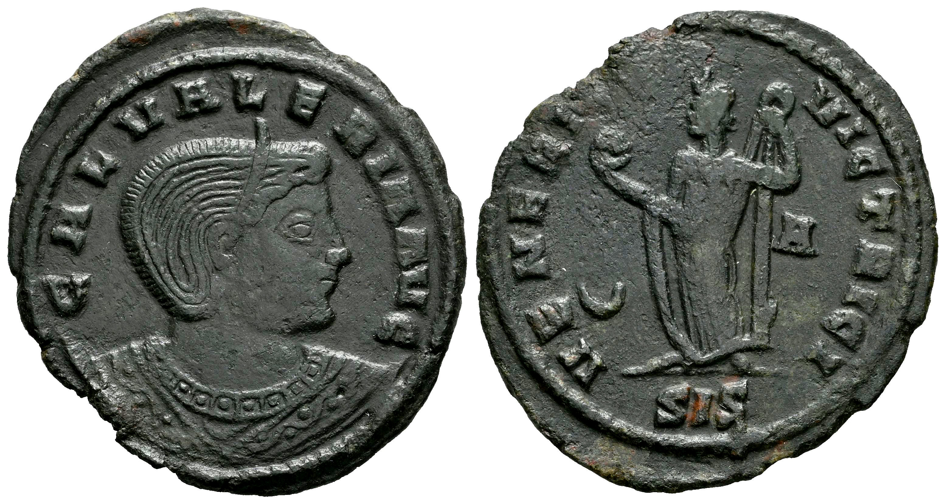 Galeria Valeria. Follis. 309-310 AD. Siscia. (Ric-VI 204). (Tesorillo-Galeria Valeria 4, Plate Coin). Anv.: GAL VALERIA AVG, diademed and draped bust to right set on crescent. Rev.: VENERI VICTRICI, Venus standing facing, head to left, holding apple and raising drapery; crescent in left field, Γ in right; SIS in exergue. Ae. 5,47 g. Slightly tooled fields. Choice VF/VF. Est...80,00.