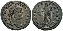 Severus II. Follis. 307 AD. Cyzicus. (Ric-VI 27b). (C-31). (Tesorillo-Severo II 3, Plate Coin). Anv.: IMP C FL VAL SEVERVS P F AVG, laureate head to righ. Rev.: GENIO POPVLI ROMANI, Genius standing facing, head to left, naked except for chlamys over left shoulder, holding patera from which liquid flows and cornucopiae; star in right field, KB in exergue. Ae. 9,17 g. Choice VF. Est...100,00.