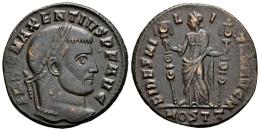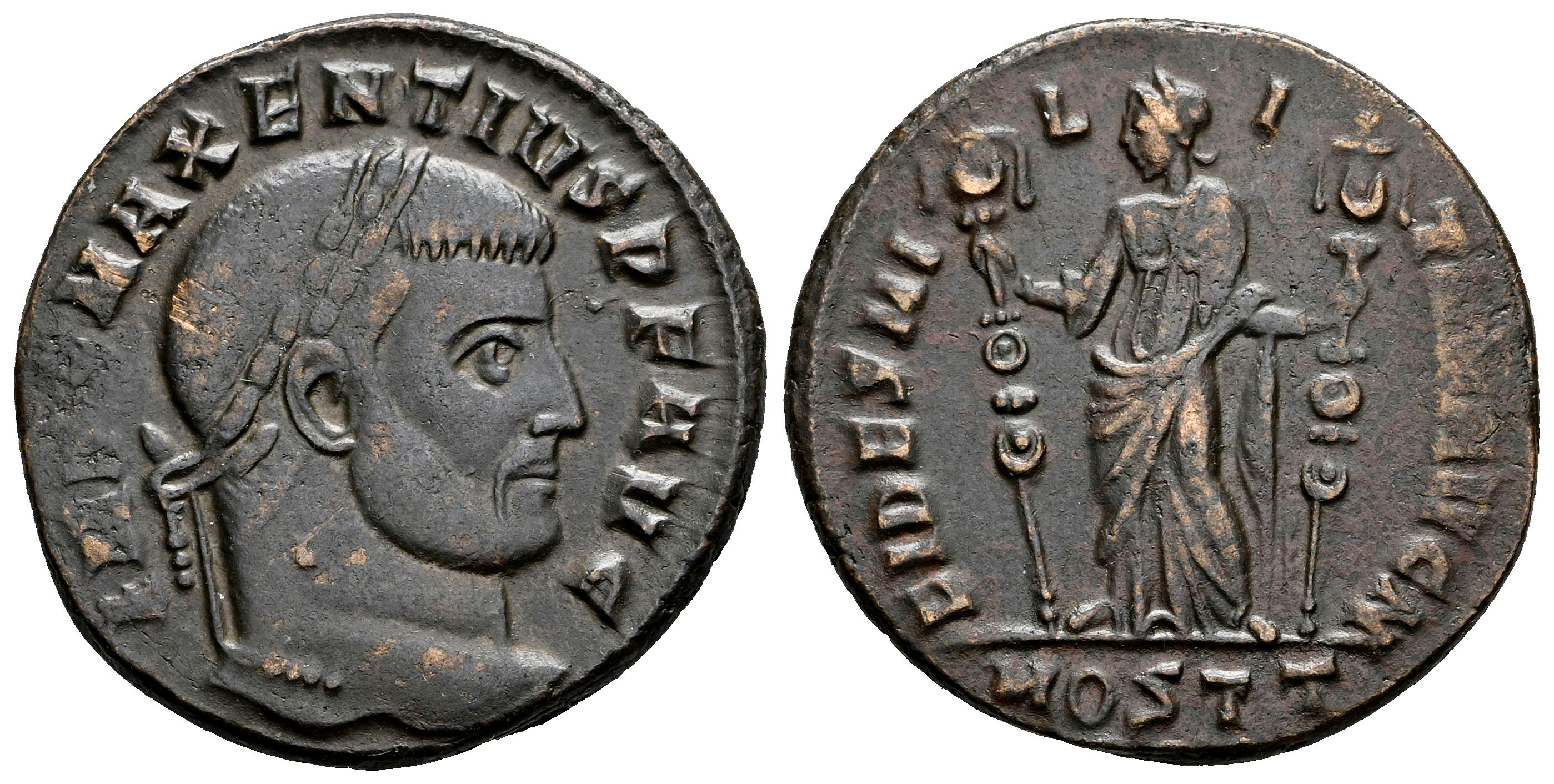 Maxentius. Follis. 309-312 AD. Ostia. (Ric-VI 45). (Tesorillo-Majencio 6, Plate Coin). Anv.: IMP C MAXENTIVS P F AVG, laureate bust to right. Rev.: FIDES MILITVM AVG N, Fides standing to left, holding standard in each hand; MOSTT in exergue. Ae. 6,71 g. Ex J. Cayón. Madrid Numismatic convention (April 2004). Included original label. VF/Choice VF. Est...60,00.