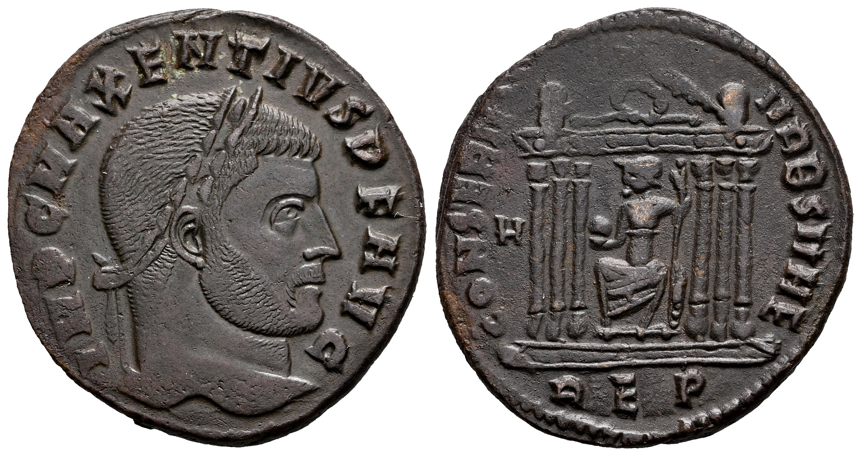 Maxentius. Follis. 310-311 AD. Rome. (Ric-VI 258). (Tesorillo-Majencio 5, Plate Coin). Anv.: IMP C MAXENTIVS P F AVG, laureate head to right. Rev.: CONSERV VRB SVAE, Roma seated facing, head to left, holding globe and sceptre, with shield by left side, in hexastyle temple with knobs as acroteria, wreath in pediment; H in left field, REP in exergue. Ae. 6,29 g. Ex J. Cayón. Madrid Numismatic Convention (April 2004). Included original label. Choice VF. Est...60,00.
