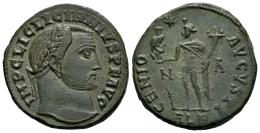 Licinius I. Follis. 312-313 AD. Cyzicus. (Ric-VI 160a). (C-35). (Tesorillo-Licinio I 9, Plate Coin). Anv.: IMP C LIC LICINNIVS P F AVG, laureate head right. Rev.: GENIO AVGVSTI, Genius standing left, holding head of Serapis and cornucopia, star above, palm at feet left; N-A across fields, ALE in exergue. Ae. 5,54 g. Scarce. Beautiful green patina. Ex Gert Boersema, Vcoins (October 2011). Choice VF. Est...60,00.
