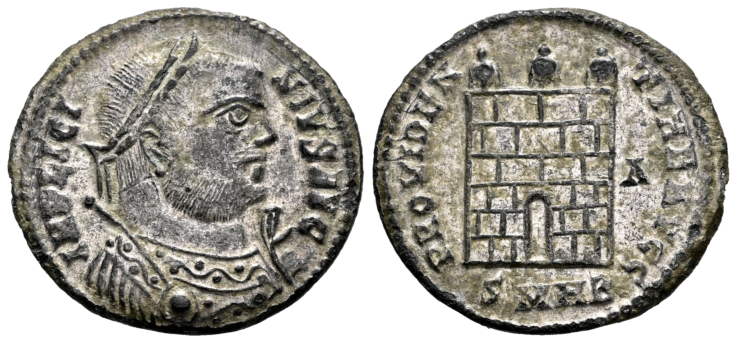 Licinius I. Follis. 318-320 AD. Heraclea. (Ric-48 var. bust.). (Tesorillo-Licinio I 23, Plate Coin). Anv.: IMP LICINIVS AVG, laureate and draped bust right, holding mappa, globe and sceptre. Rev.: PROVIDENTIAE AVGG, camp gate with six rows, no doors and three turrets; Λ in right field, SMHB in exergue. Bi. 2,95 g. Ex H.D. Rauch 11 (19/09/2006), lot 1397. Included original label. Almost XF. Est...50,00.