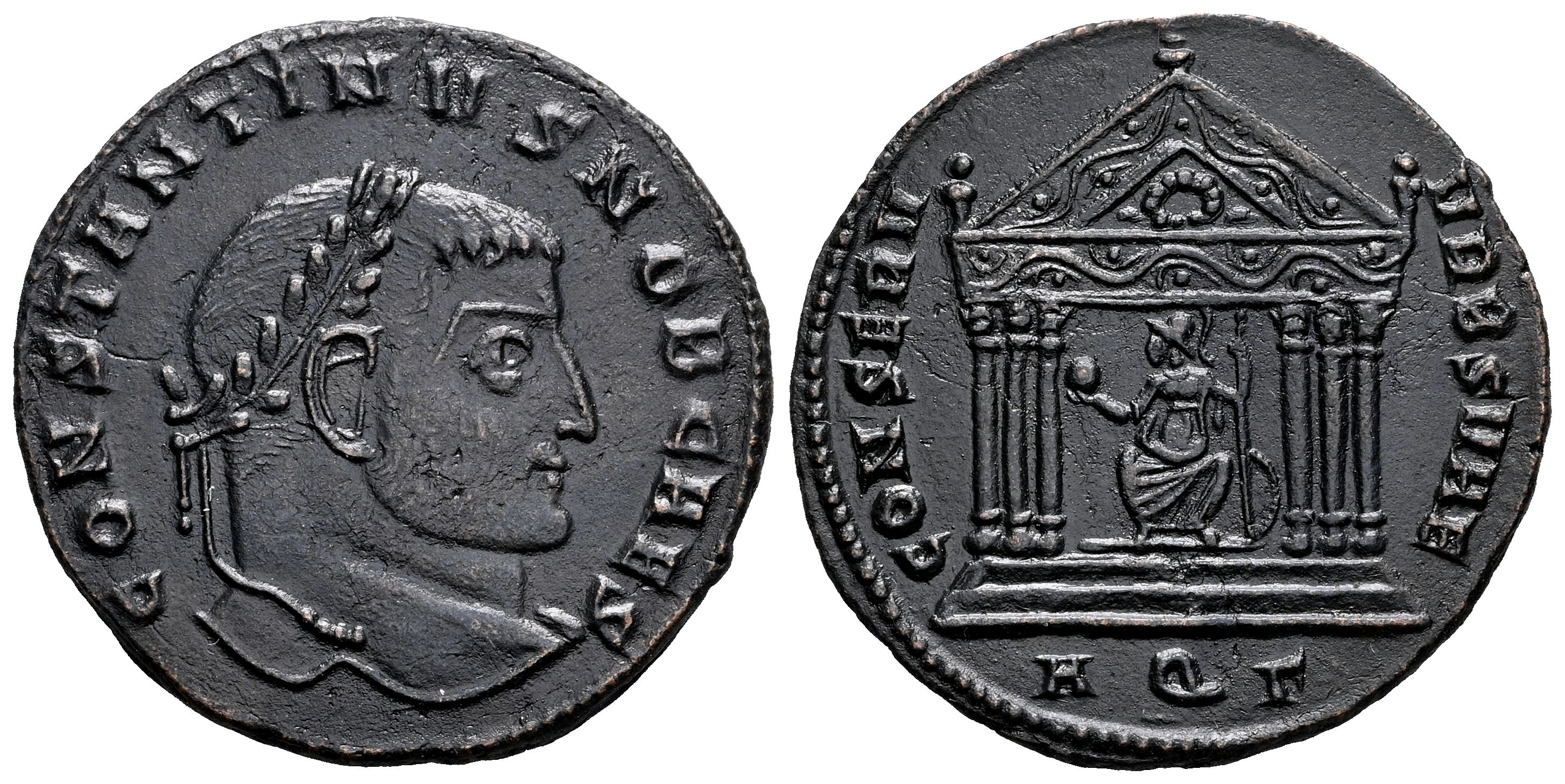 Constantinus I. Follis. 307 AD. Aquileia. (Ric-VI 117). (Tesorillo-Constantino I 14, Plate Coin). Anv.: CONSTANTINVS NOB CAES, laureate head right. Rev.: CONSERV VRBS VAE, Roma enthroned facing, head left, holding globe and sceptre; all within hexastyle temple decorated with knobs as acroteria and wreath in pediment; AQΓ in exergue. Ae. 5,01 g. Scarce. Ex Roman Lode, Vcoins (December 2012). Choice VF/Almost XF. Est...80,00.