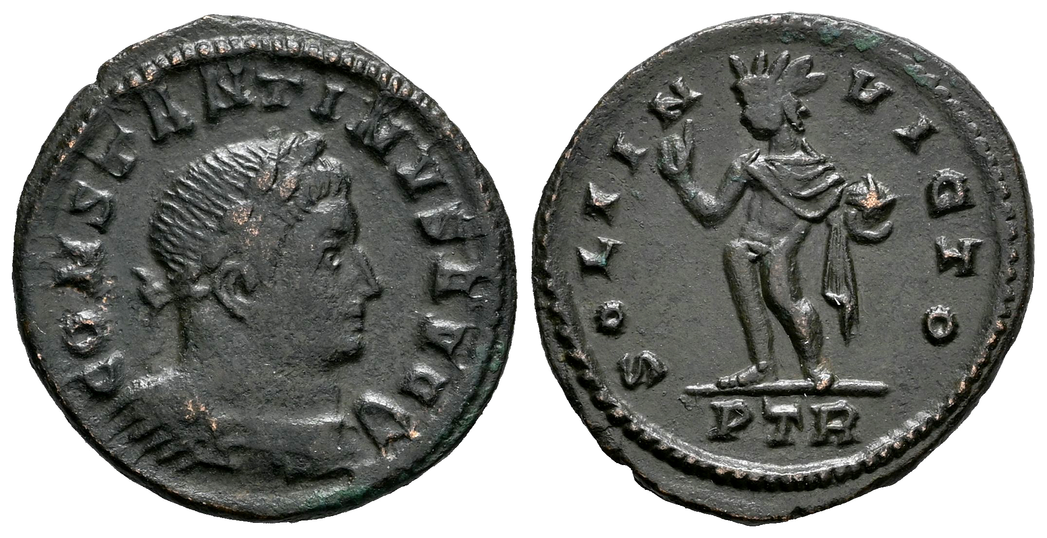 Constantinus I. 1/2 follis. 310-311 AD. Trier. (Ric-VI 899). (Tesorillo-Constantino I 91, Plate Coin). Anv.: CONSTANTINVS AVG, laureate and cuirassed bust to right. Rev.: SOLI INVICTO, radiate Sol standing facing, head to left with chlamys around shoulders, with right hand raised and holding globe in left; PTR in exergue. Ae. 2,61 g. Scarce. Ex V. Craven. Madrid Numismatic Convention (May 2008). VF/Choice VF. Est...40,00.