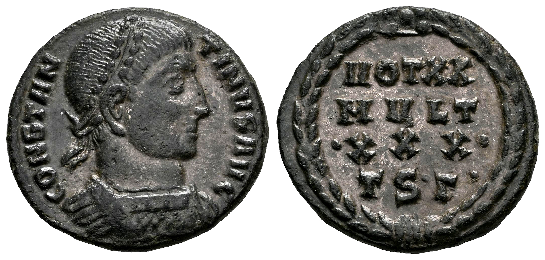 Constantinus I. Follis. 318-319 AD. Thessalonica. (Ric-VII 31). (Tesorillo-Constantino I 134, Plate Coin). Anv.: CONSTANTINVS AVG, laureate and cuirassed bust right. Rev.: VOT XX MVLT •XXX• TS•Γ• in four lines within wreath. Bi. 2,89 g. Rare. Ex Roman Lode, Vcoins (February 2007). Choice VF. Est...80,00.