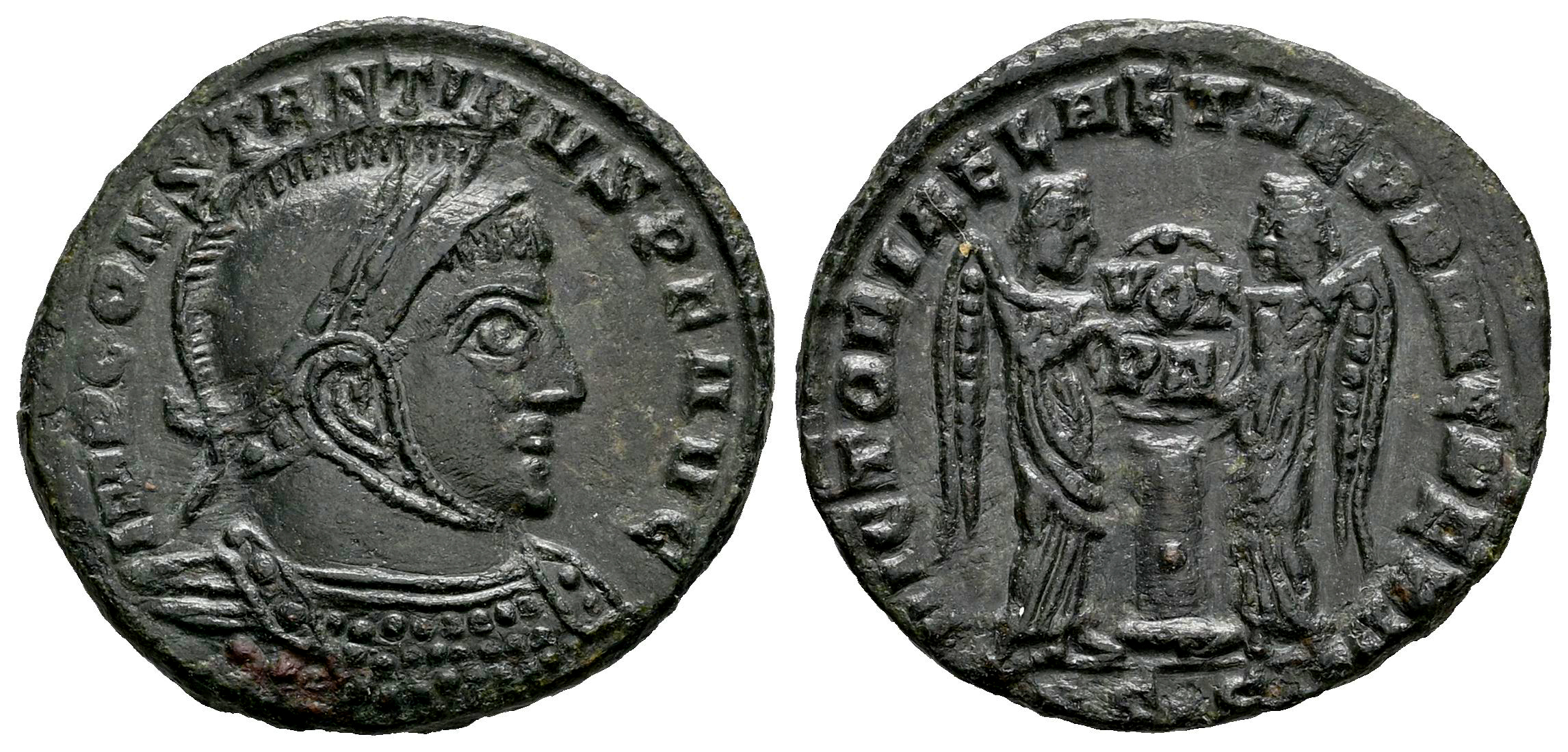 Constantinus I. Follis. 318-319 AD. Siscia. (Ric-VII 47). (Tesorillo-Constantino I 108, Plate Coin). Anv.: IMP CONSTANTINVS P F AVG, laureate, helmeted and cuirassed bust to right. Rev.: VICTORIAE LAETAE PRINC PERP, two Victories standing facing each other, holding between them shield inscribed VOT PR in two lines above altar; ASIS* in exergue. Ae. 2,87 g. Choice VF. Est...50,00.