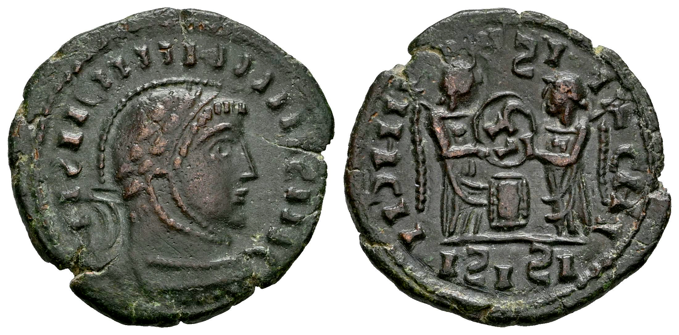 Constantinus I. Follis. 318 AD. Siscia. Barbaric Imitation. (Ric-Type VII 47/53). (Tesorillo-Constantino I 113, Plate Coin). Anv.: IIƧIICIIIIIIIIIIƧIIIC, laureate, helmeted and cuirassed bust to right. Rev.: IIIↃIII-IƧI-ICHI two Victories standing facing each other, holding between them shield inscribed IIIC in two lines on altar; IƧIƧI in exergue. Ae. 2,72 g. Ex Rutten & Weiland, Vcoins (November 2006). Choice VF. Est...50,00.