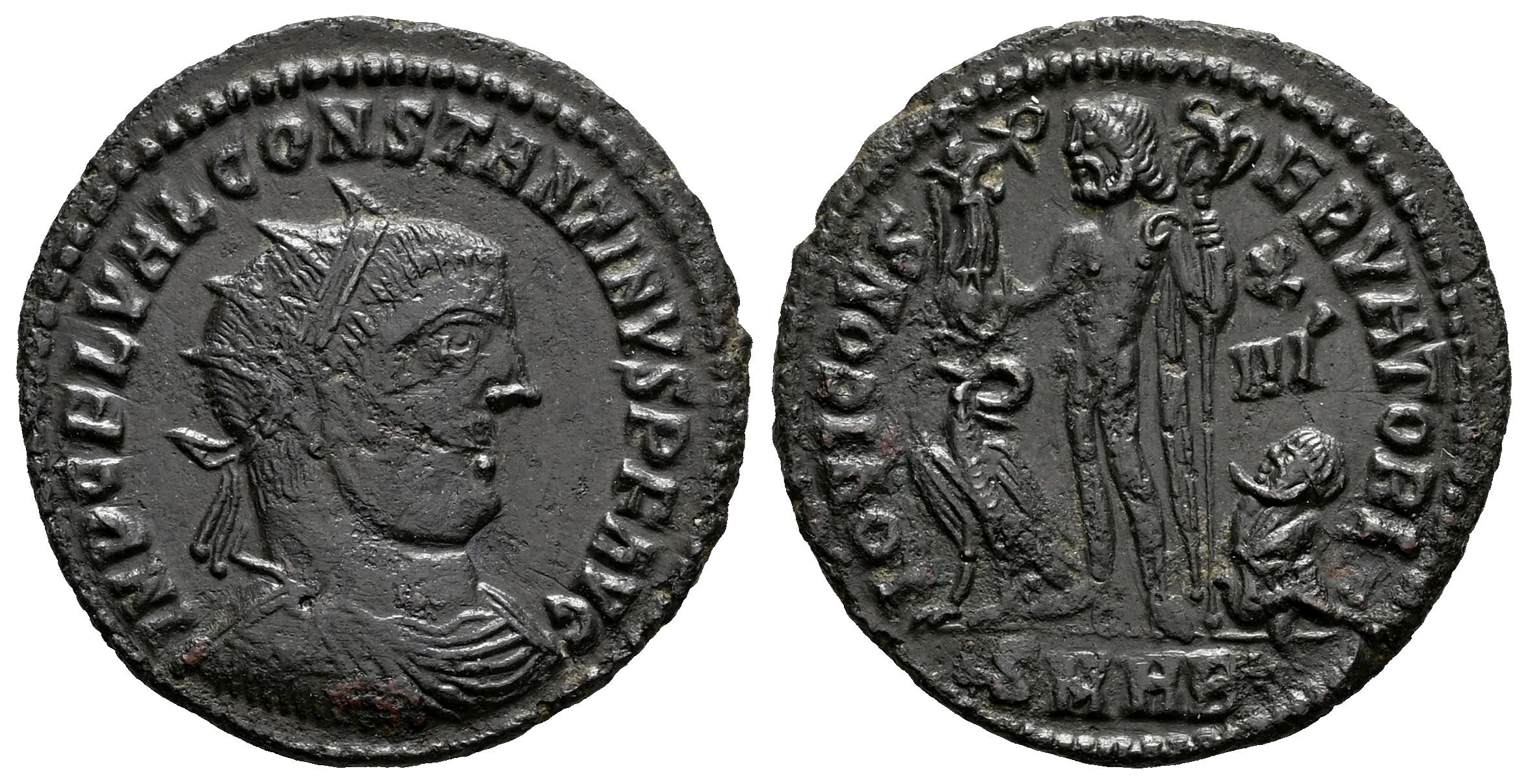 Constantinus I. Follis. 307/10-337 AD. Heraclea. (Ric-VII 51). (C-292). (Tesorillo-Constantino I 58, Plate Coin). Anv.: IMP C L VAL CONSTANTINVS P AVG. Radiate, draped and cuirassed bust right. Rev.: IOVI CONSERVATORI. Jupiter standing let between eagle with wreath in beak and seated captive, holding Victory on globe and eagletipped sceptre; X / II Γ in right field , SMHB in exergue. Ae. 2,59 g. Metal defect on obverse. VF/Choice VF. Est...30,00.