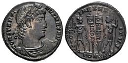 Constantinus I. Follis. 330-333 AD. Constantinople. (Ric-VII 59). (Tesorillo-Constantino I 43, Plate Coin). Anv.: CONSTANTINVS MAX AVG, diademed, draped and cuirassed bust to right. Rev.: GLORIA EXERCITVS, two soldiers helmeted, standing facing one another, reversed spear in outer hands, inner hands on shields resting on ground; between them two standards; CONSB· in exergue. Ae. 2,64 g. A good sample. Obverse partly incused on the reverse. Mint state/Almost MS. Est...50,00.