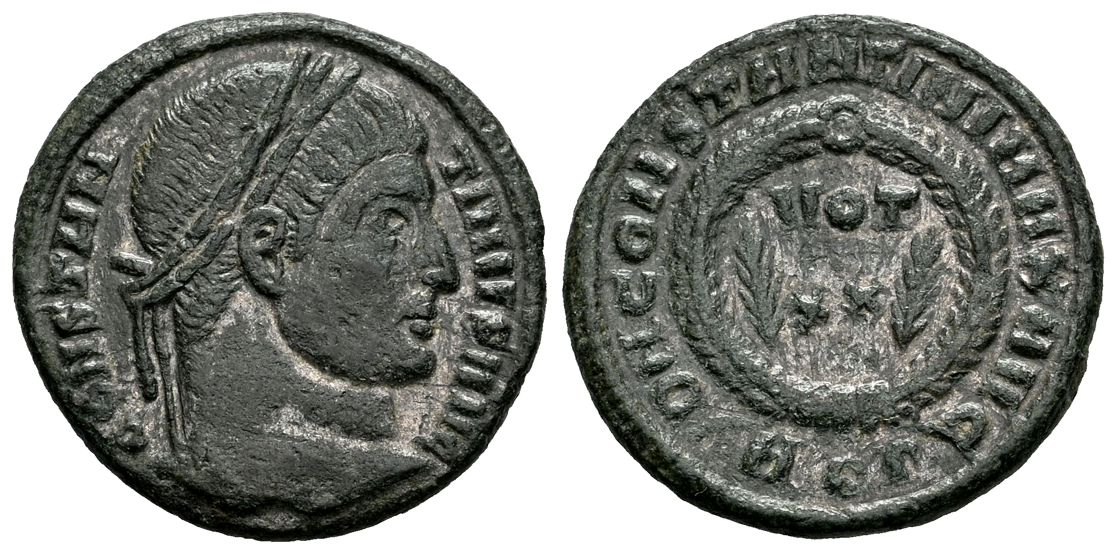 Constantinus I. Follis. 322 AD. Aquileia. (Ric-VII 104). (Tesorillo-Constantino I 26, Plate Coin). Anv.: CONSTANTINVS AVG, laureate head to right. Rev.: D N CONSTANTINI MAX AVG, wreath enclosing VOT • XX in three lines, laurel branches flanking; AQP in exergue. Bi. 3,09 g. Ex Ancient Delights, at the present Mayor 25. (March 2004). VF. Est...40,00.