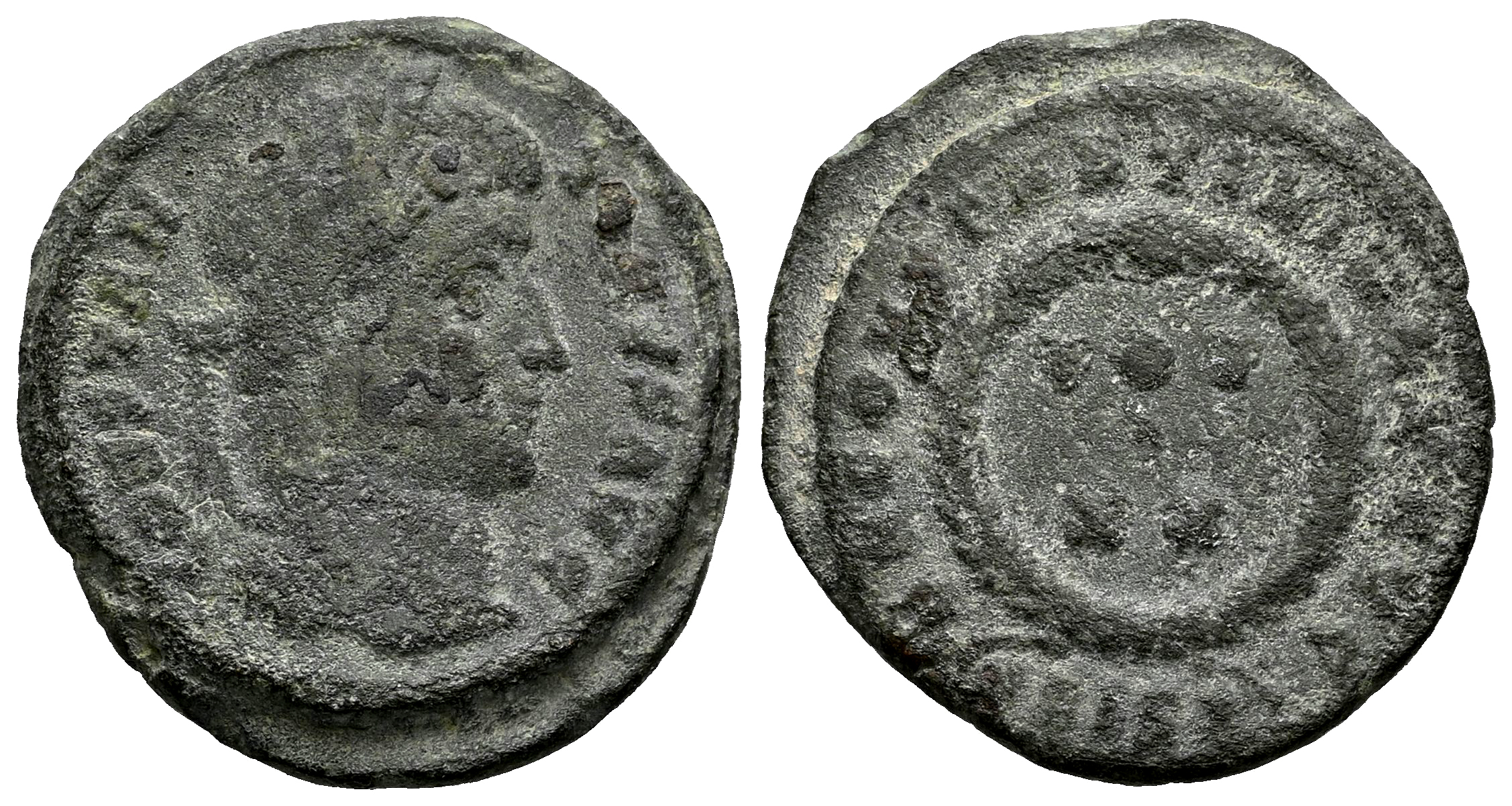 Constantinus I. Follis. 320-321 AD. Siscia. (Ric-Tipo VII 159). (Tesorillo-Constantino I 30, Plate Coin). Anv.: CONSTANTINVS AVG, laureate head to right. Rev.: D N CONSTANTINI MAX AVG, wreath enclosing VOT•XX in two lines; ЄSIS(star) in exergue. Ae. 4,28 g. Interesting cast Barbarian imitation. We can clearly see how the obverse is offset from the reverse, a result of the use of molds in the casting process. It is unusual to find period contenporary counterfeits cast from originals in this period. Rare. Almost VF. Est...60,00.