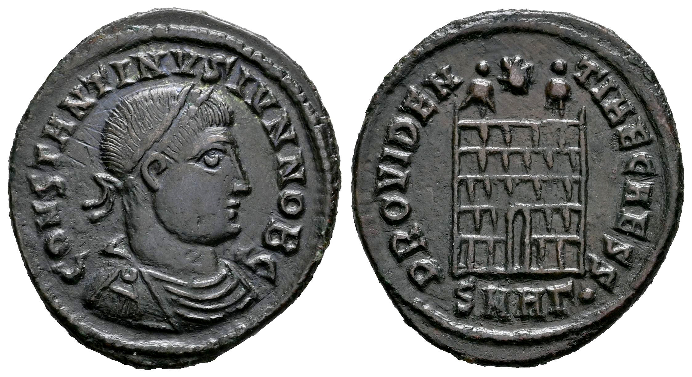 Constantinus II. Follis. 326 AD. Heraclea. (Ric-VII 83). (Tesorillo-Constantino II 44, Plate Coin). Anv.: CONSTANTINVS IVN NOB C, laureate, draped and cuirassed bust to right. Rev.: PROVIDENTIAE CAESS, camp gate with two turrets, no door, star above; SMHΓ• in exergue. Ae. 2,98 g. Rare with this officina. VF/Choice VF. Est...45,00.