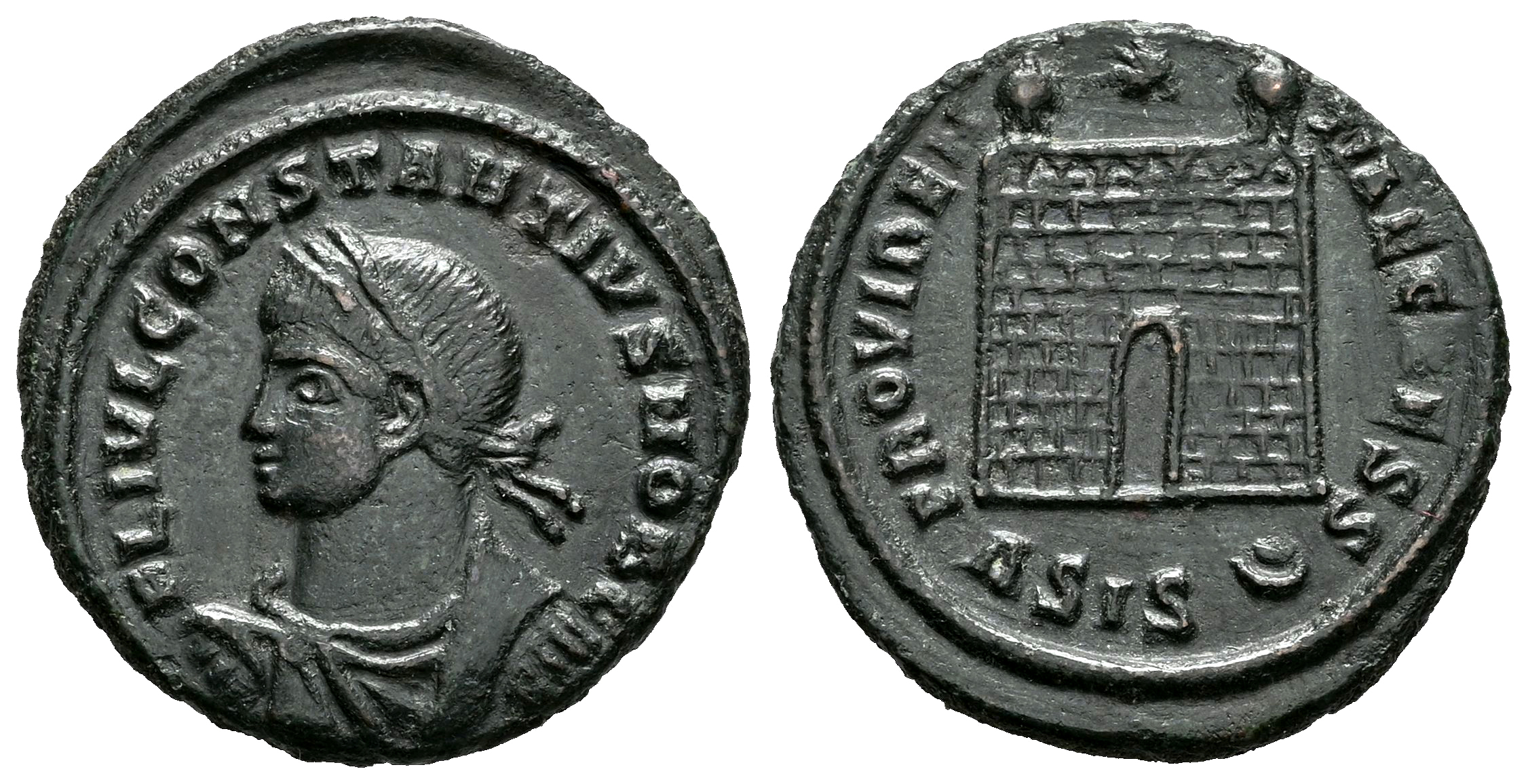 Constantius II. Follis. 328-329 AD. Siscia. (Ric-VII 127). (Tesorillo-Constancio II 62, Plate Coin). Anv.: FL IVL CONSTANTIVS NOB C, laureate, draped and cuirassed bust to left. Rev.: PROVIDENTIAE CAESS, camp gate with no doors, two turrets, star above; ΔSIS(double crescent) in exergue. Ae. 3,18 g. Ex Ancient Delights, at the present Mayor 25. (March 2004). Choice VF. Est...45,00.
