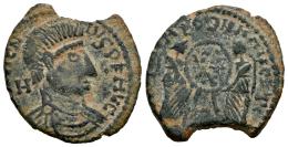 Magnentius. 1/2 maiorina. 351-353 AD. (Tesorillo-Magnencio 26, Plate Coin). Anv.: (D N MAG)NENIVS P F HVG, bare-headed, draped and cuirassed bust to right; H behind. Rev.: (VICTORI)AE DD NN AVG ET C, two Victories standing facing one another, together holding shield inscribed VOT X; Ƨ below, ¿? in exergue. Ae. 2,38 g. Barbarous imitation. Planchet break. Choice VF. Est...40,00.