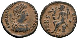 Valentinian II. Centenionalis. 378-392 AD. Antioch. (Ric-X 51.1). (LRBC-2870). (Tesorillo-Valentiniano II 18, Plate Coin). Anv.: D N VALENTINIANVS IVN P F AVG, pearl-diademed, draped and cuirassed bust to right. Rev.: VRBS ROMA, Roma seated to left on cuirass, holding Victory on globe and spear; star in right field, ANTB in exergue. Ae. 2,53 g. Almost XF. Est...50,00.