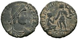 Magnus Maximus. Maiorina. 383-388 AD. Arelate. (Ric-IX 26a). (Tesorillo-M. Máximo 3, Plate Coin). Anv.: (D N MAG) MAXIMVS P F AVG, pearl-diademed, draped and cuirassed bust to right. Rev.: REPARATIO (REI)PVB, emperor standing to left, raising kneeling turreted female to left and holding Victory on globe; PCON in exergue. Ae. 4,76 g. Ex J. Vico 140 (06/11/2014), lot 119. Almost VF/VF. Est...45,00.