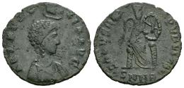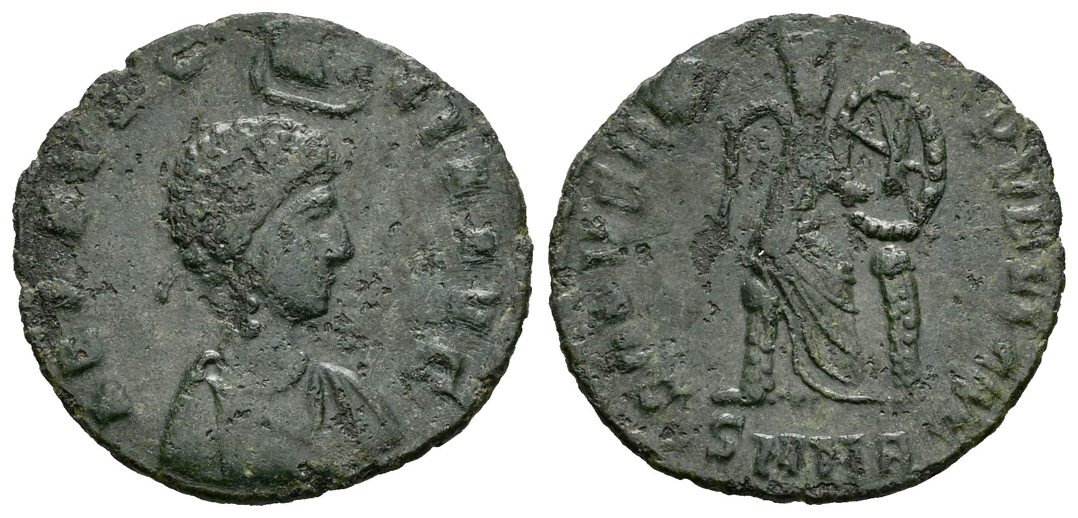 Aelia Eudoxia. Follis. 401-403 AD. Nicomedia. (Ric-X 102). (Tesorillo-Eudoxia 2, Plate Coin). Anv.: AEL EVDOXIA AVG. Diademed and draped bust right, being crowned by the hand of God above. Rev.: SALVS REIPVBLICAE. Victory seated right on cuirass, supporting shield inscribed with christogram; SMNA in exergue. Ae. 1,63 g. Almost VF/VF. Est...80,00.