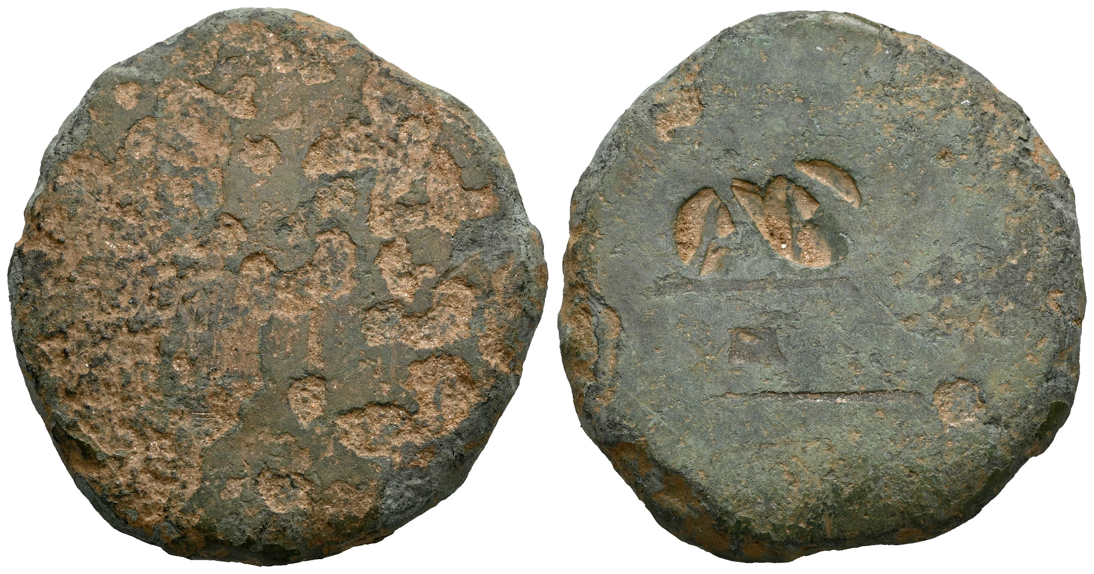 Anonymous. Unit. 211 BC. Rome. (Craw-56/2). (Tesorillo-3-08, Plate Coin). Anv.: Laureate head of Janus; I (mark of value) above. Rev.: Prow of galley to right; I (mark of value) above, ROMA below. Ae. 20,51 g. Two countermarks "A" within a circle on the reverse. Rare. Almost F. Est...45,00.