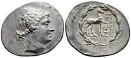 Aeolis. Kyme. Tetradrachm. 155-140 BC. Kallias magistrate. (Sng von Aulock-166). (Sng Cop-103). (Sng Delepierre-2556). Anv.: Head of the Amazon Kyme to right, wearing tainia. Rev.: Horse prancing to right; one-handled cup below raised foreleg, KYMAIΩN downwards to right, KAΛΛIAΣ below; all within wreath. Ag. 16,81 g. Light double strike on reverse. Attractive. Almost XF. Est...1500,00.
