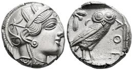 Attica. Athens. Tetradrachm. 454-404 BC. (Gc-2526). (Sng Cop-31). (Kroll-8). Anv.: Head of Athena right, wearing crested Attic helmet ornamented with three olive leaves above visor and spiral palmette on bowl. Rev.: Owl standing to right with head facing, olive sprig and crescent behind, ΑΘΕ before; all within incuse square. Ag. 17,09 g. Nice obverse strike with fine style and minimal oxidation on the reverse. Part of the crest and collar visible. Mint state/AU. Est...1200,00.