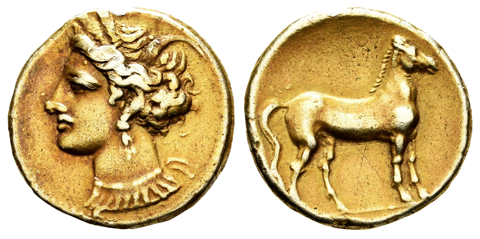 North Africa. Carthage. Stater. 310-270 BC. (Jenkins & Lewis-Group VI). (MAA-13). (CNP-206p). Anv.: Wreathed head of Tanit to left, wearing triple-pendant earring and pendant necklace. Rev.: Horse standing to right on ground line; ¿three pellets? on line. El. 7,73 g. Minor scratches and cut metal test on the edge. Nice color. Choice VF. Est...1500,00.