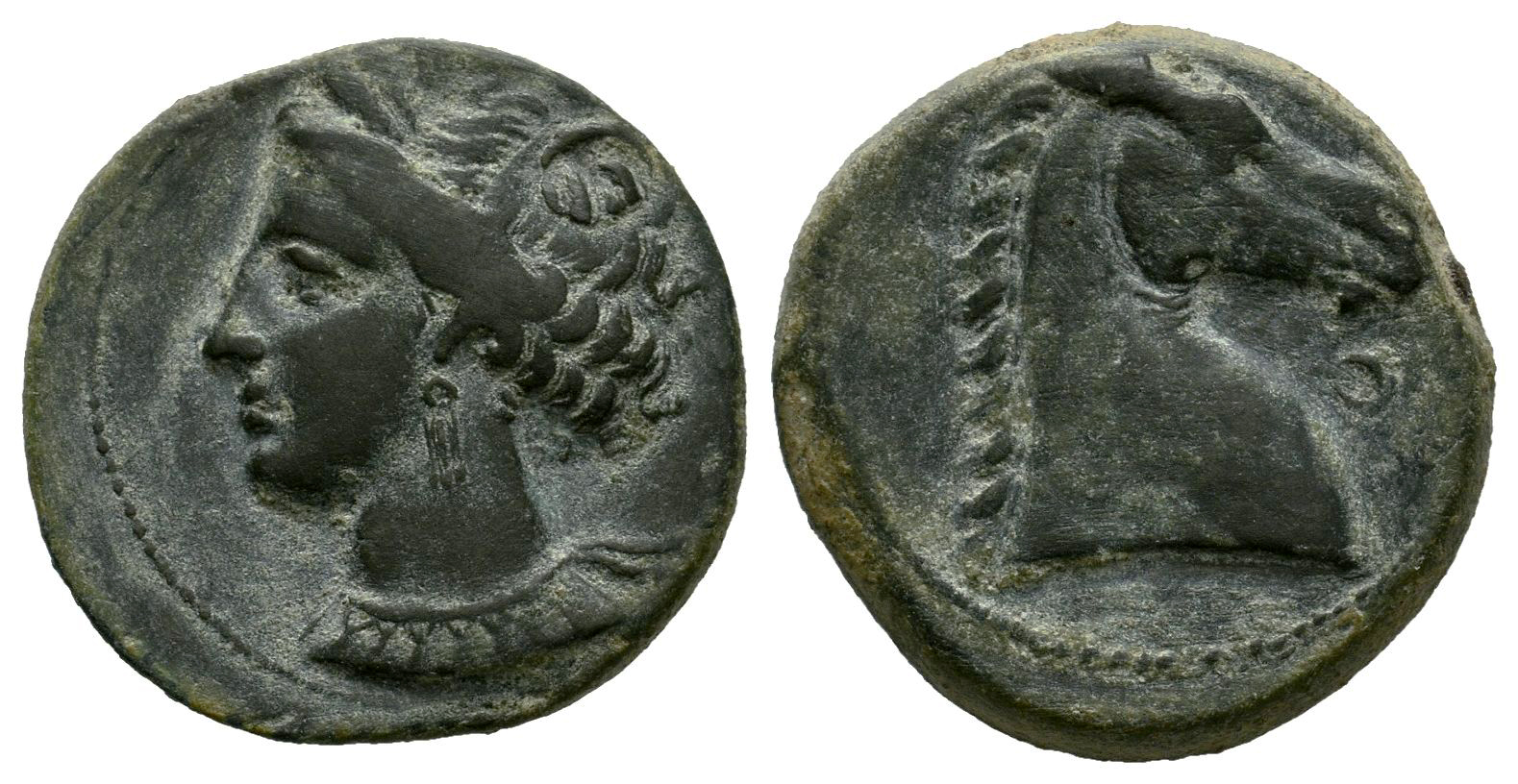 North Africa. Carthage. Chalkous. 300-264 BC. (CNP-251u). Anv.: Wreathed head of Tanit to left. Rev.: Head of horse to right; Punic 'ayin' before. Ae. 5,31 g. Attractive. Choice VF. Est...100,00.