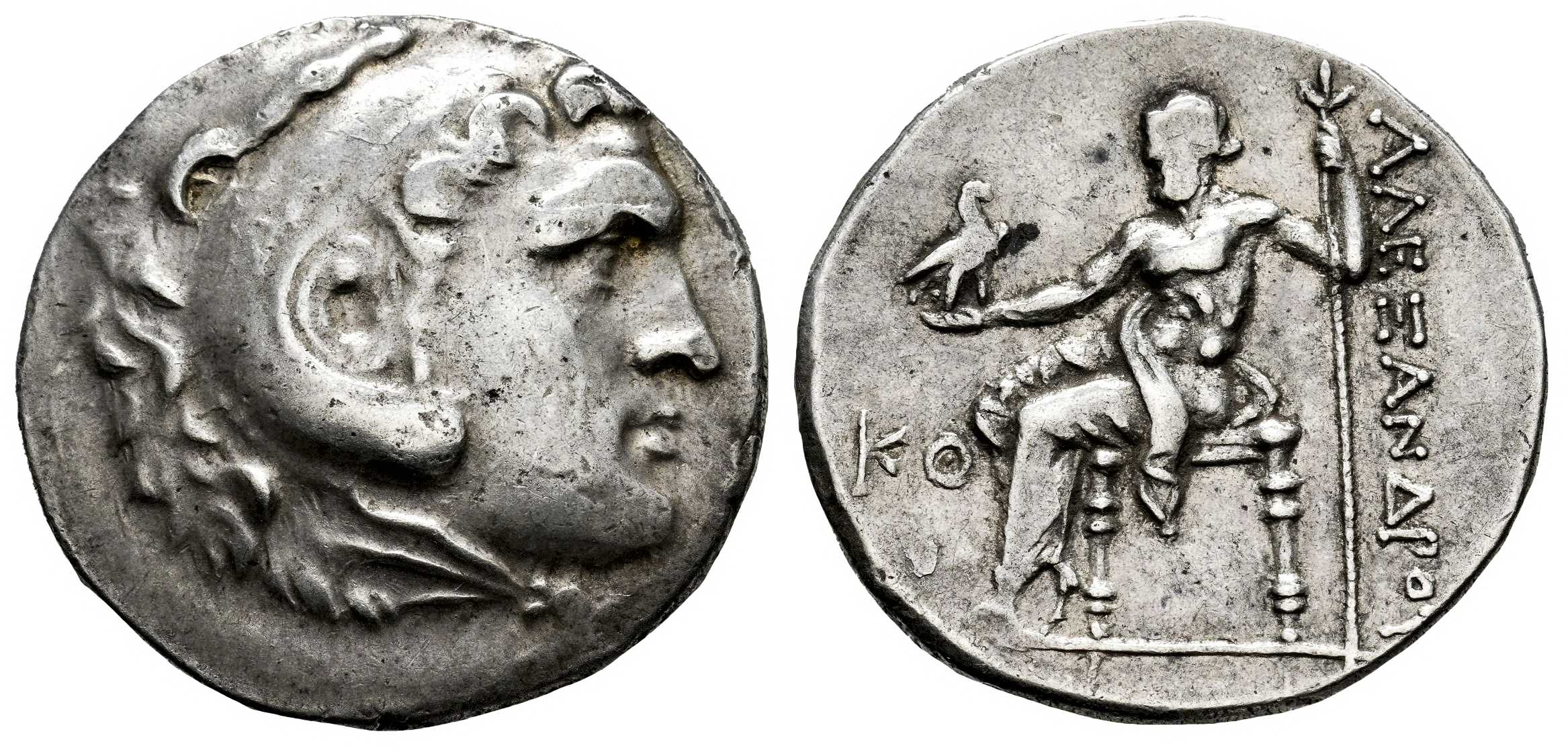 Pamphylia. Perge. Tetradrachm. CY 29 = 193/2 BC. In the name and types of Alexander III of Macedon. (Price-2943). (DCA-314). Anv.: Head of Herakles to right, wearing lion skin headdress. Rev.: Zeus Aëtophoros seated to left, holding sceptre; AΛEΞANΔPOY in right field, KΘ (date) in left field. Ag. 16,89 g. Choice VF. Est...300,00.