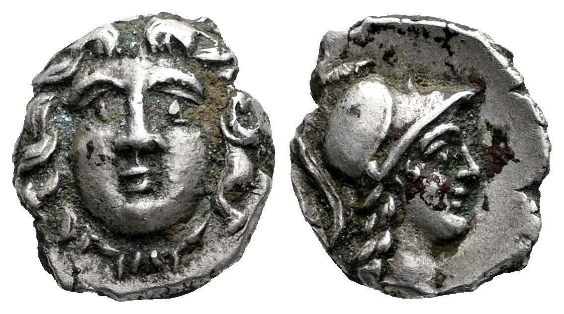 Pisidia. Selge. Obol. 350-300 BC. (Sng von Aulock-5280). Anv.: Facing gorgoneion. Rev.: Head of Athena to right, wearing crested Attic helmet; behind, (astragalos and monogram). Ag. 0,93 g. Good strike for this type. Deposits. Almost XF. Est...80,00.