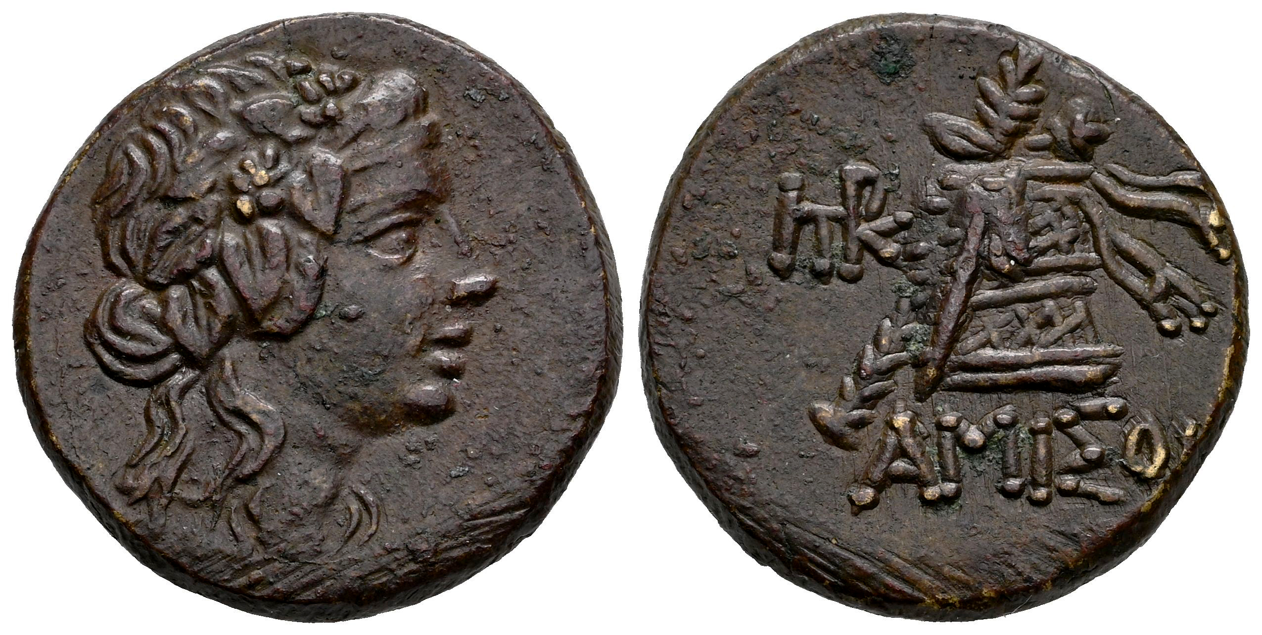 Pontos. Amisos. AE 21. 105-90 or 100-95 BC. Time of Mithradates VI Eupator. (SNG Stancomb-698). (SNG BM Black Sea-1205). (Hgc-7, 243). Anv.: Ivy-wreathed head of Dionysos to right. Rev.: Fileted thyrsos leaning against cista mystica draped with panther skin; monogram in left field, ΑΜIΣOY below. Ae. 7,44 g. Attractive patina. Almost XF. Est...100,00.