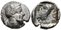 Attica. Athens. Tetradrachm. 454-404 BC. (Kroll-8). (Sng Cop-31). (Hgc-4, 1597). Anv.: Head of Athena to right, wearing crested Attic helmet ornamented with three olive leaves above visor and spiral palmette on bowl, round earring with central boss and pearl necklace. Rev.: Owl standing to right with head facing, olive sprig and crescent behind, ΑΘΕ before; all within incuse square. Ag. 17,11 g. Crest visible almost in its entirety. Lightly toned. Ex Wayne Scheible collection, Classical Numismatic Group 557 (06/03/2024), lot 61. Included original label. Choice VF. Est...750,00.
