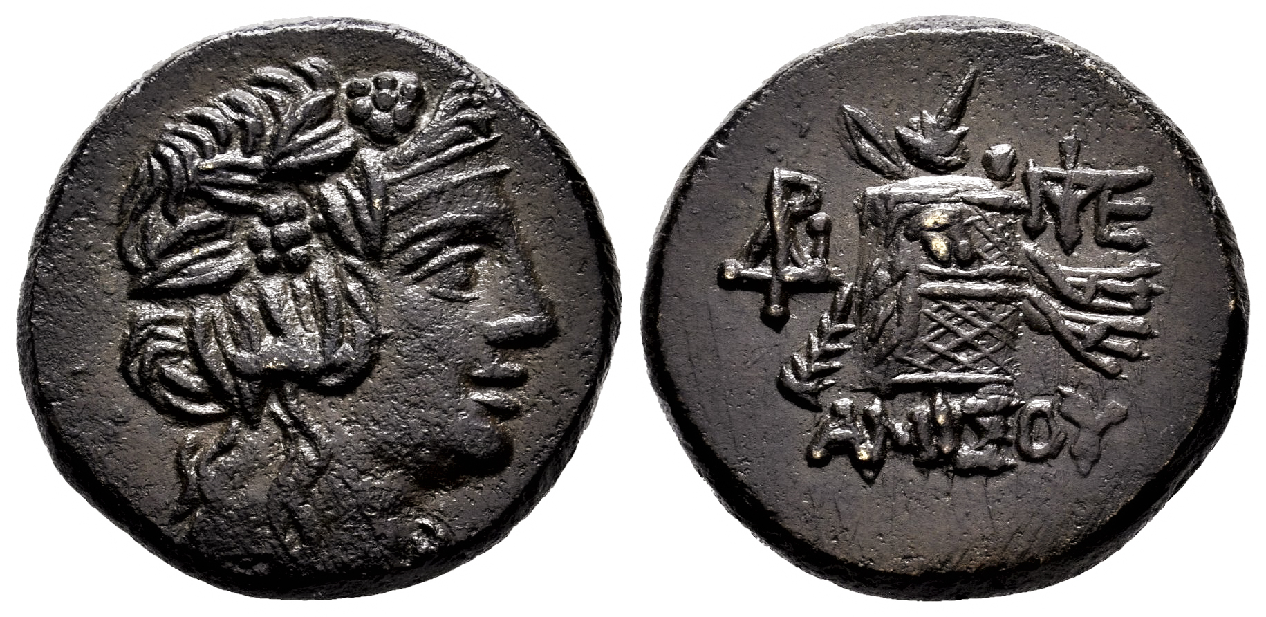 Pontos. Amisos. AE 22. 85-65 BC. Time of Mithradates VI. (SNG BM Black Sea-1209). (SNG Stancomb-699). (Hgc-7, 243). Anv.: Wreathed head of Dionysos to right. Rev.: Thyrsos leaning against cista mystica draped with panther skin; monogram in left field, ΑΜIΣOY below. Ae. 8,44 g. A good sample. Almost XF. Est...100,00.