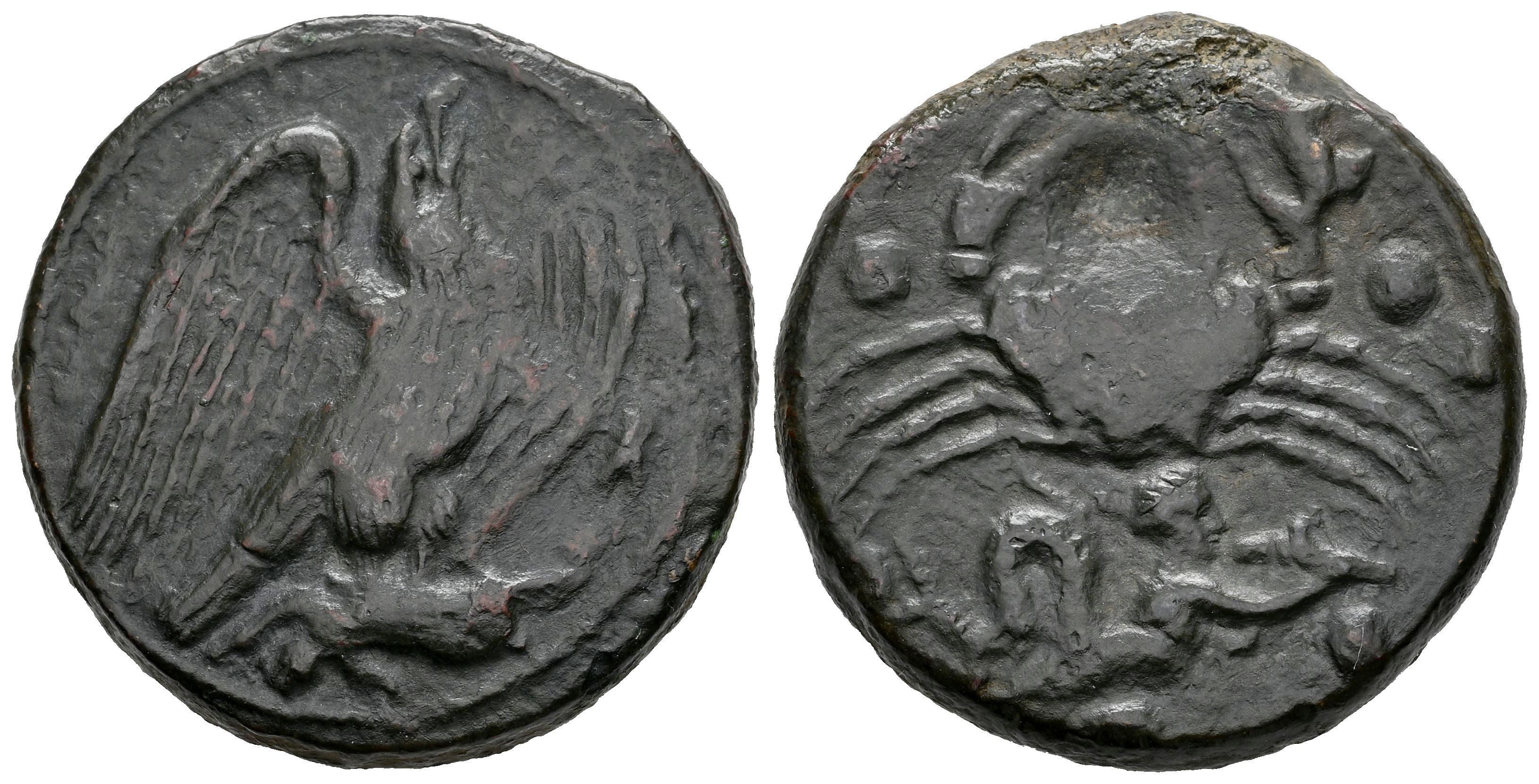 Sicily. Akragas. Hemilitron. 415-406 BC. (CNS-32). (Bmc-89). (Sng Cop-71). Anv.: ΑΚΡΑΓΑΤΙΝΟΝ (anticlockwise), eagle with spread wings standing to right on hare, head raised; cicada to right. Rev.: Crab; triton to right below, blowing conch-shell; six pellets (mark of value) around. Ae. 22,12 g. VF. Est...150,00.