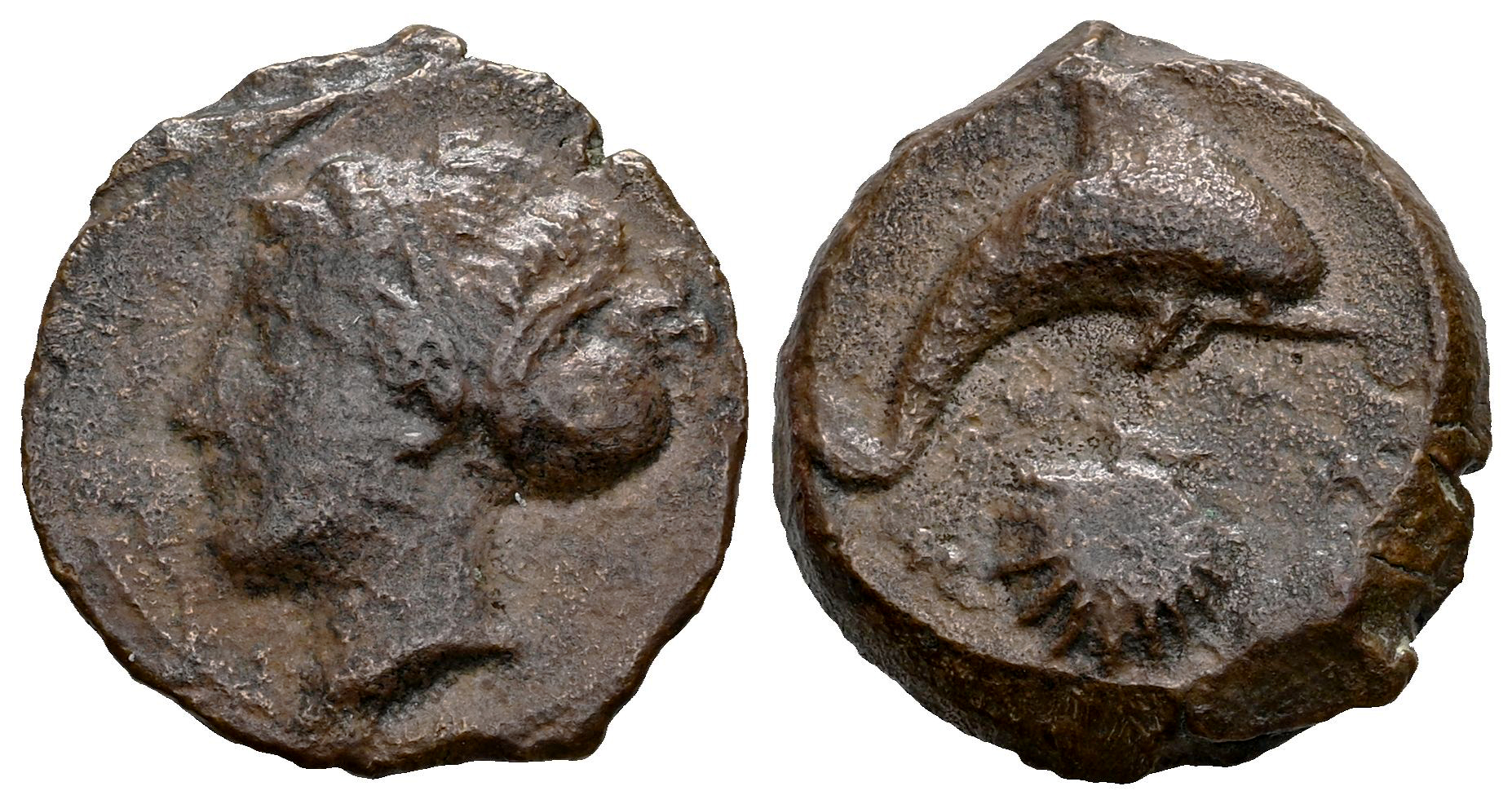 Sicily. Syracuse. AE 16. 415-405 BC. Time of the Second Democracy. (CNS-II 24). (Sng Ans-417). (Hgc-2, 1480). Anv.: Head of Arethusa to left. Rev.: Dolphin to right; cockle shell below, ΣVPA between. Ae. 3,11 g. Almost VF/VF. Est...60,00.