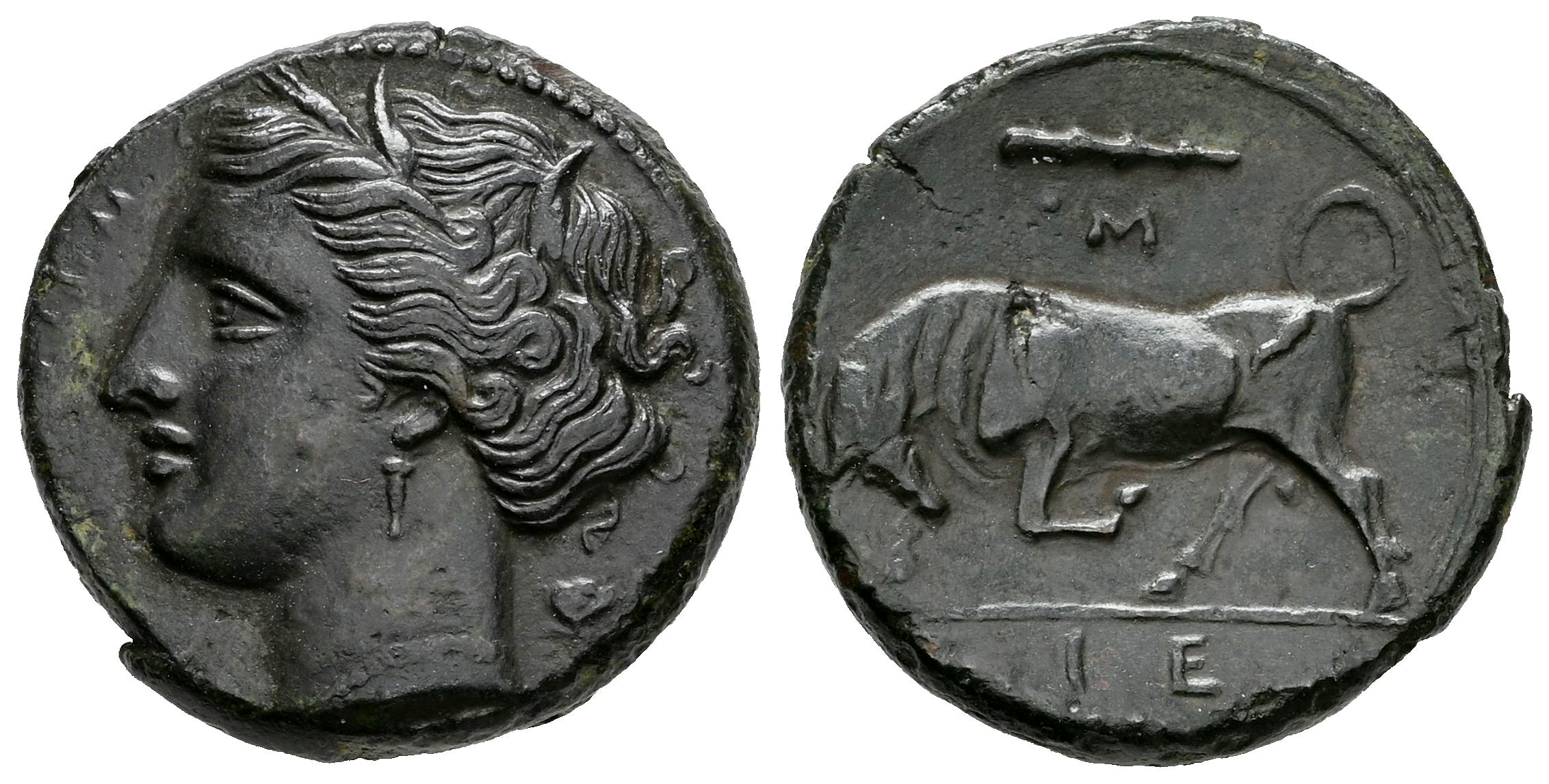 Sicily. Syracuse. AE 19. 317-289 BC. Time of Agathokles. (Sng Ans-580). (Calciati-II 345, 191Ds 65RI 12). Anv.: Head of Arethusa to left; ΣΥΡΑΚΟΣΙΩΝ before, bunch of grapes behind. Rev.: Bull butting to left; Club above with M below, I E in exergue . Ae. 5,79 g. A good sample. Rare in this condition. Ex Hess Divo 310 (22/10/2008), lot 34. XF. Est...200,00.