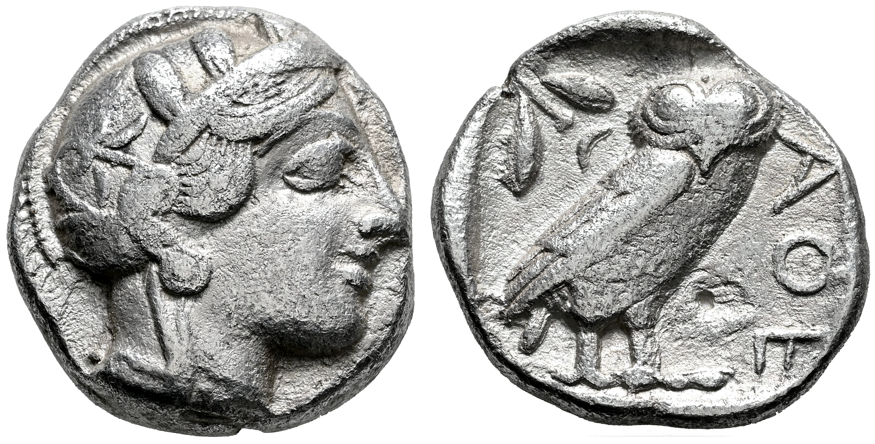 Attica. Athens. Tetradrachm. 454-404 BC. (Kroll-8). (Sng Cop-31). (Hgc-4, 1597). Anv.: Head of Athena to right, wearing crested Attic helmet ornamented with three olive leaves above visor and spiral palmette on bowl, round earring with central boss and pearl necklace. Rev.: Owl standing to right with head facing, olive sprig and crescent behind, ΑΘΕ before; all within incuse square. Ag. 16,15 g. Punch mark on reverse. VF/Almost VF. Est...300,00.