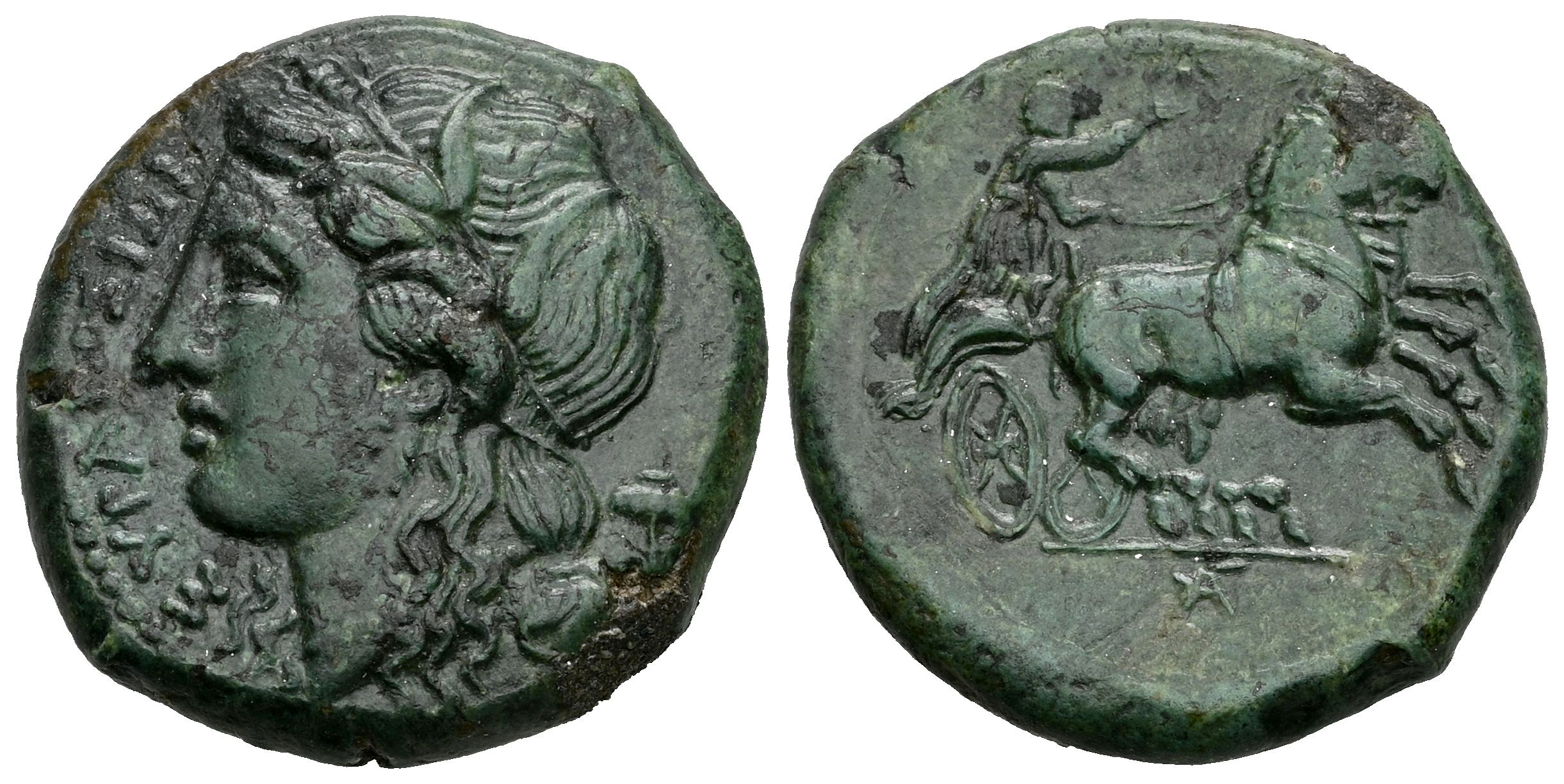 Sicily. Syracuse. Hemilitron. 287-283 BC. Time of Hiketas II. (CNS-125). (Sng Ans-772). (Hgc-2, 1466). Anv.: Head of Kore to left, wearing corn wreath; ΣYPAKOΣIΩN before. Rev.: Nike driving biga to right; star above, monogram in exergue. Ae. 7,34 g. Beautiful green patina. Ex Classical Numismatic Group 260 (20/07/2011), lot 1. Choice VF. Est...250,00.
