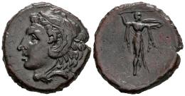 Sicily. Syracuse. AE 24. 278-276 BC. Tiempos de Pyrrhos. (CNS-II Nr. 177 Ds 69 Rs 109). (Hgc-2, 1450). Anv.: Head of Herakles to left, wearing lion skin headdress; ΣYPAKOΣIΩN upwards before. Rev.: Athena Promachos standing to right, brandishing thunderbolt and shield . Ae. 9,52 g. Slightly smoothed fields. Almost XF/VF. Est...120,00.