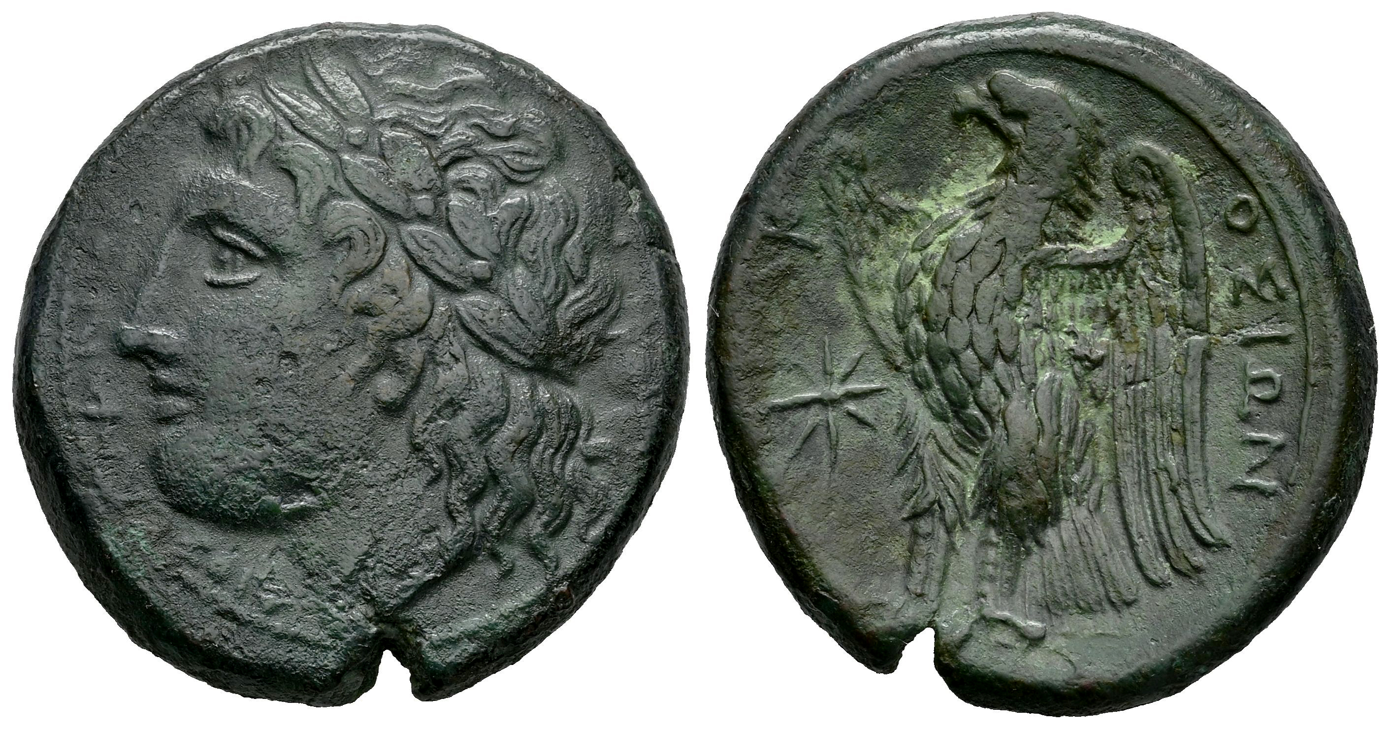 Sicily. Syracuse. AE 25. 287-278 BC. Time of Hiketas II. (Hgc-2, 1448). Anv.: Laureate head of Zeus Hellanios to left; ΔΙΟΣ ΕΛΛΑΝΙΟΥ before, trophy behind. Rev.: Eagle with spread wings standing to left on thunderbolt; ΣΥΡΑΚ-ΟΣΙΩΝ around, A above star to left. Ae. 11,56 g. Choice VF/Almost XF. Est...120,00.