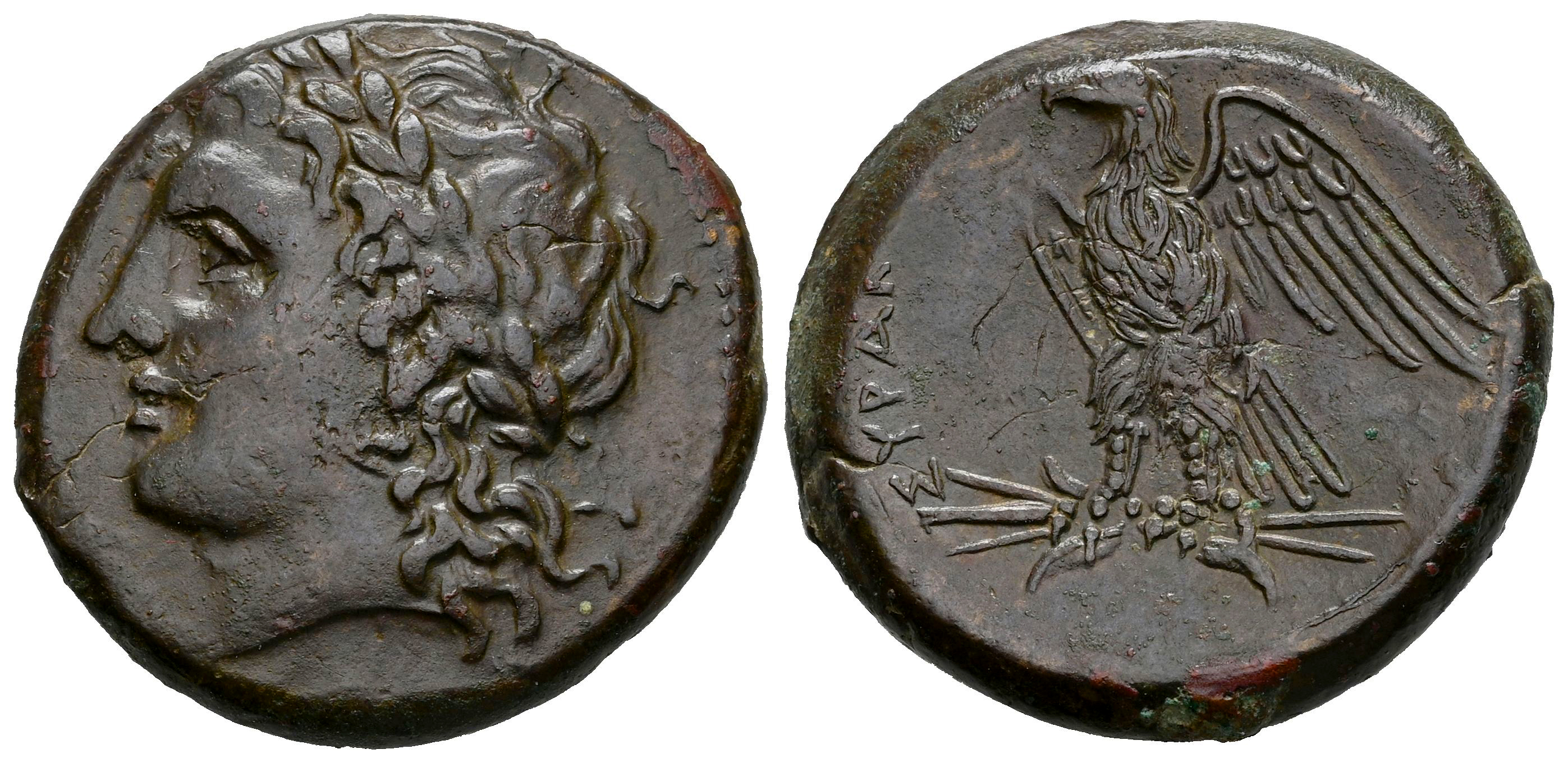 Sicily. Syracuse. AE 24. 287-278 BC. Time of Hiketas II. (CNS-254). (Hgc-2, 1448). Anv.: (ΔΙΟΣ ΕΛΛΑΝΙΟΥ), laureate head of Zeus Hellanios to left. Rev.: ΣΥΡΑΚ(ΟΣΙΩΝ), eagle standing to left on thunderbolt. Ae. 11,48 g. Beautiful brown patina. Almost XF/XF. Est...150,00.