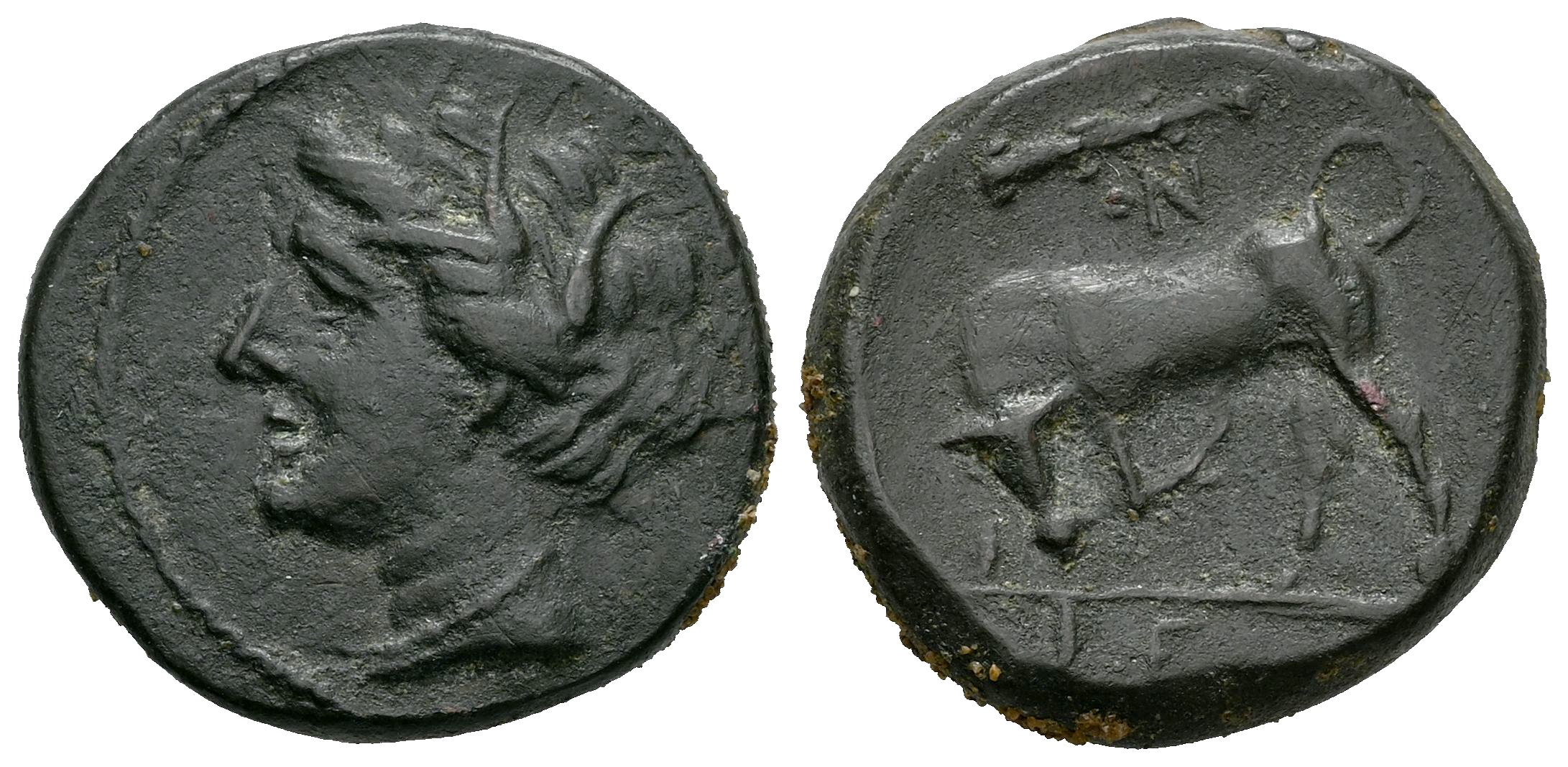 Sicily. Syracuse. AE 18. 275-265 BC. Time of Hieron II. (CNS-II 199 Ds 41 R1 8). (Hgc-2, 1497). Anv.: Wreathed head of Kore to left. Rev.: Bull butting to left; club and N above, IE in exergue. Ae. 5,46 g. Choice VF. Est...90,00.