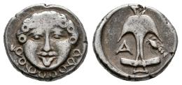 Thrace. Apollonia Pontika. Drachm. Late 5th-4th centuries BC. (SNG BM Black Sea-160/1). (Sng Cop-457). (Tesorillo-Tracia 13, Plate Coin). Anv.: Gorgoneion. Rev.: Anchor; A and crayfish flanking, all within circular incuse. Ag. 2,85 g. VF/Choice VF. Est...75,00.