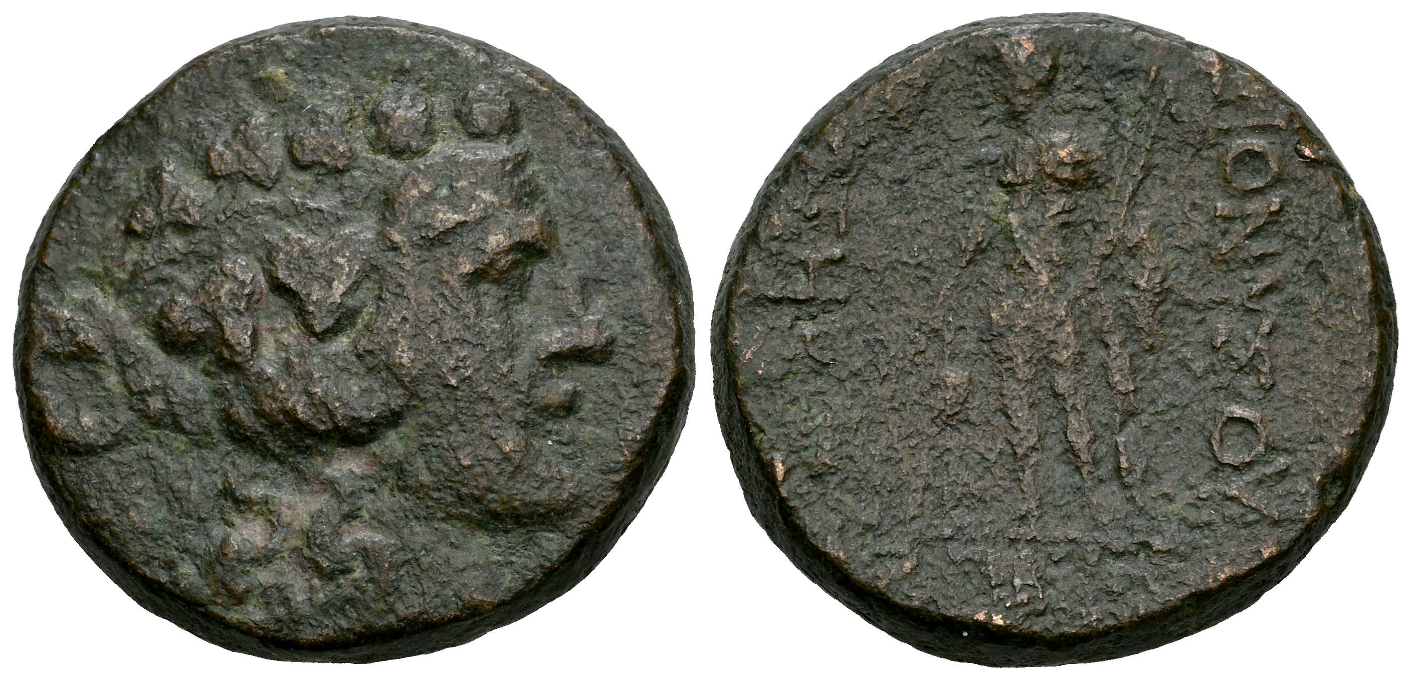 Thrace. Maroneia. AE 23. 168-145 BC. (Schönert-Geiss-1354/1405). (Hgc-3.2,1557). Anv.: Head of Dionysos to right, wearing ivy-wreath. Rev.: ΔIONYΣOY ΣΩTHPOΣ MAPΩNITΩN, Dionysos standing to left holding grape bunch and spears; monogram to lower left. Ae. 12,04 g. F/Almost F. Est...25,00.