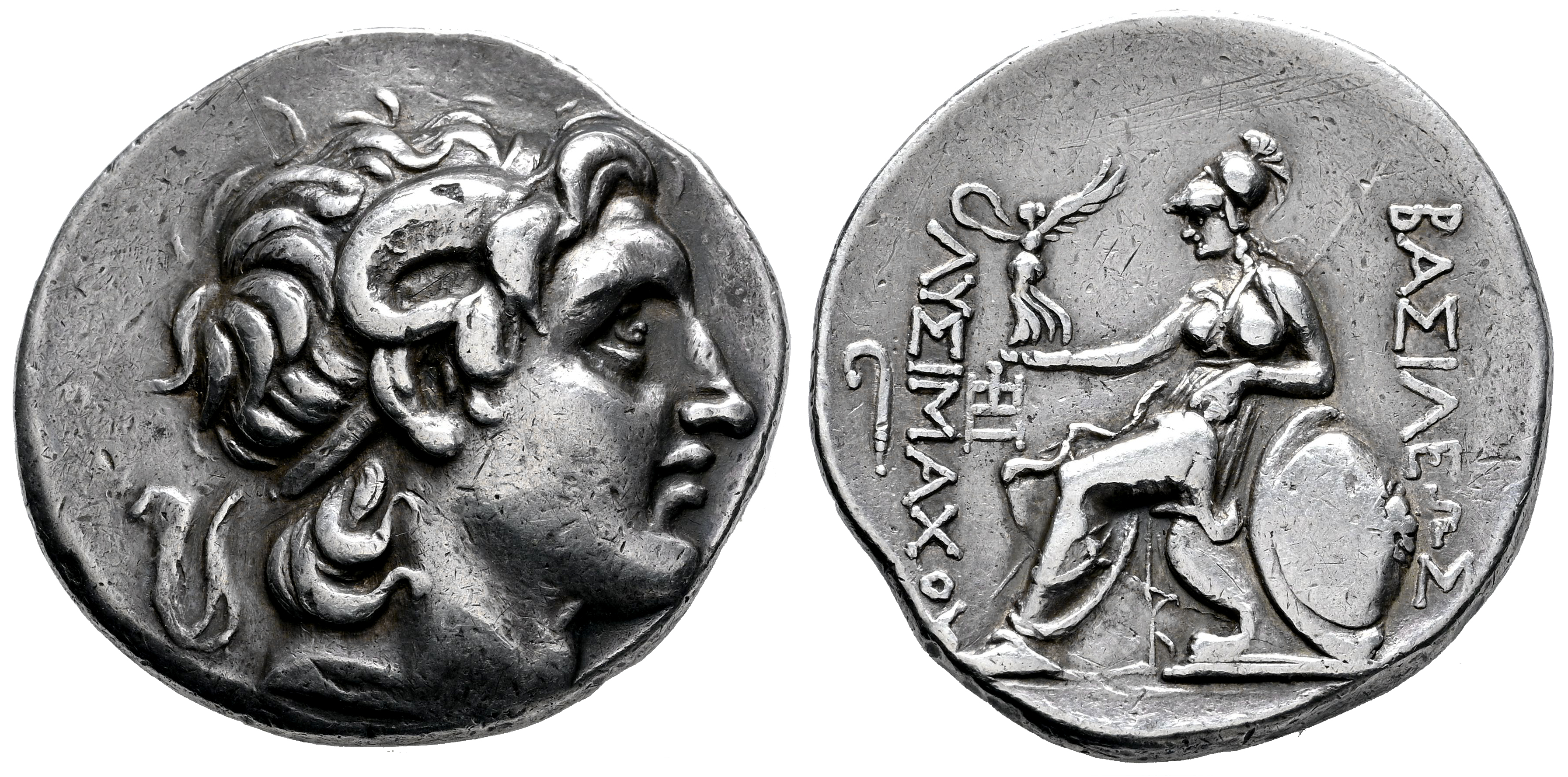 Kingdom of Thrace. Lysimachos. Tetradrachm. 297-281 BC. (Thompson-Unlisted). (Müller-Unlisted). Anv.: Diademed head of the deified Alexander to right, with horn of Ammon. Rev.: Athena Nikephoros seated to left, left arm resting on shield, spear behind; BΑΣΙΛΕΩΣ to right, ΛΥΣΙΜΑXΟΥ to left, crook to outer left, monogram to inner left. Ag. 17,02 g. We haven't found any references for this monogram and crook combination. Delicate patina. Minor hairlines on reverse. Very rare. Choice VF. Est...600,00.