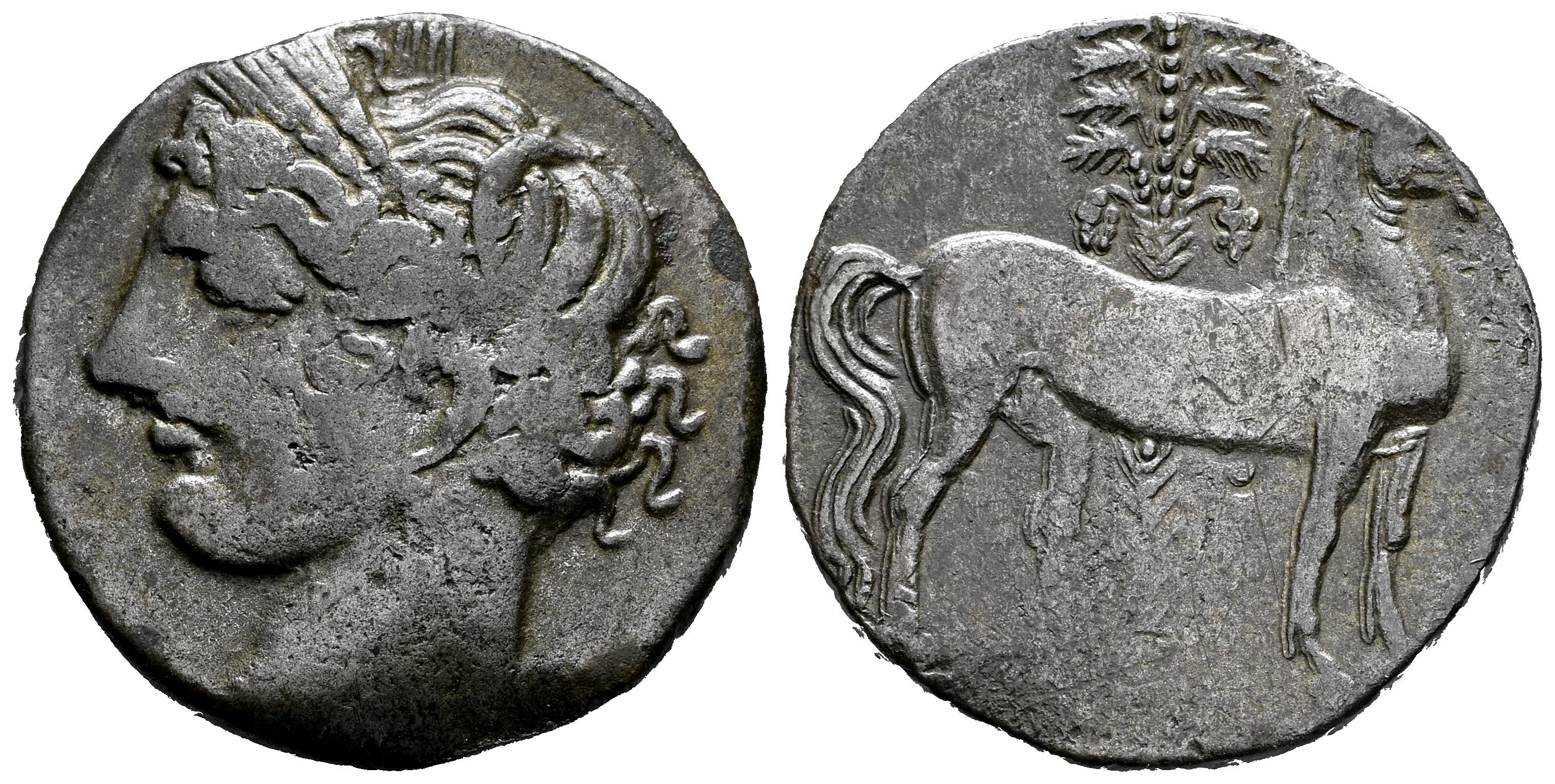 Zeugitania. Carthage. Double shekel. 264-241 BC. the First Punic War. (Sng Cop-190.1). (Müller-104). Anv.: Wreathed head of Tanit left, wearing triple-pendant earring and necklace. Rev.: Horse standing right, palm behind. Bi. 11,35 g. Delicate patina. Scarce. VF/Choice VF. Est...500,00.