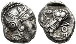 Attica. Athens. Tetradrachm. 350-294 BC. Uncertain Eastern imitation. (Kroll-8). (Sng Cop-31). Anv.: Head of Athena to right, wearing earring, necklace, and crested Attic helmet decorated with three olive leaves over visor and a spiral palmette on the bowl. Rev.: Owl standing to right with head facing, olive sprig with berry and crescent in upper left field, AΘE to right; all within incuse square. Ag. 16,92 g. Deposits. Choice F/VF. Est...200,00.