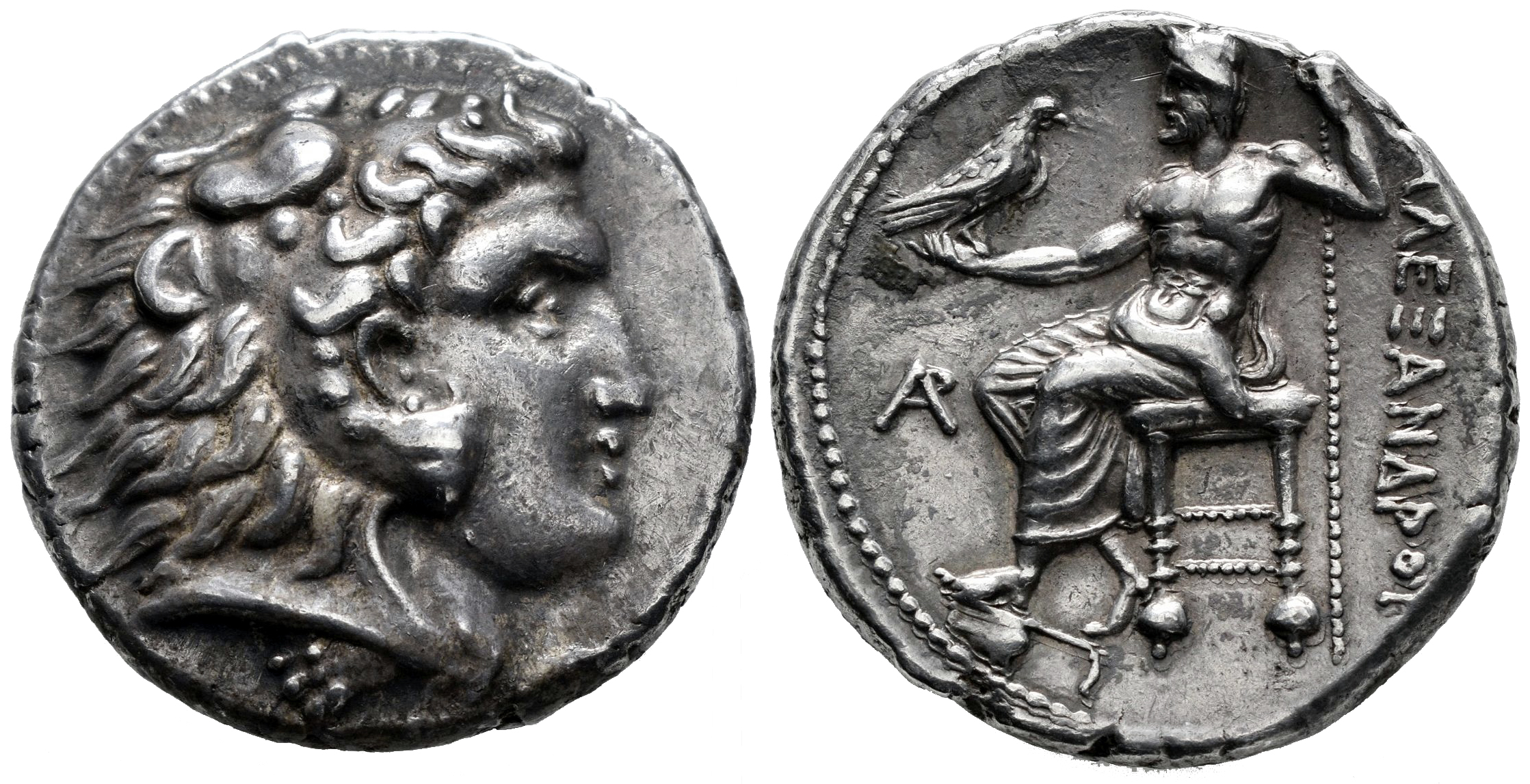 Ptolemaic Kings of Egypt. Ptolemy I Soter, as satrap. Tetradrachm. 320/19-311/0 BC. Arados. In the name and types of Alexander III of Macedon. (Price-3426 (Byblos)). (Müller-1375). Anv.: Head of Herakles to right, wearing lion skin headdress. Rev.: Zeus Aëtophoros seated to left, holding sceptre; AΛEΞANΔPOY to right, AP (civic monogram) in left field. Ag. 17,31 g. Delicate patina. Ex Classical Numismatic Group 421 (30/05/2018), lot 396. Included original label. Choice VF/Almost XF. Est...1000,00.