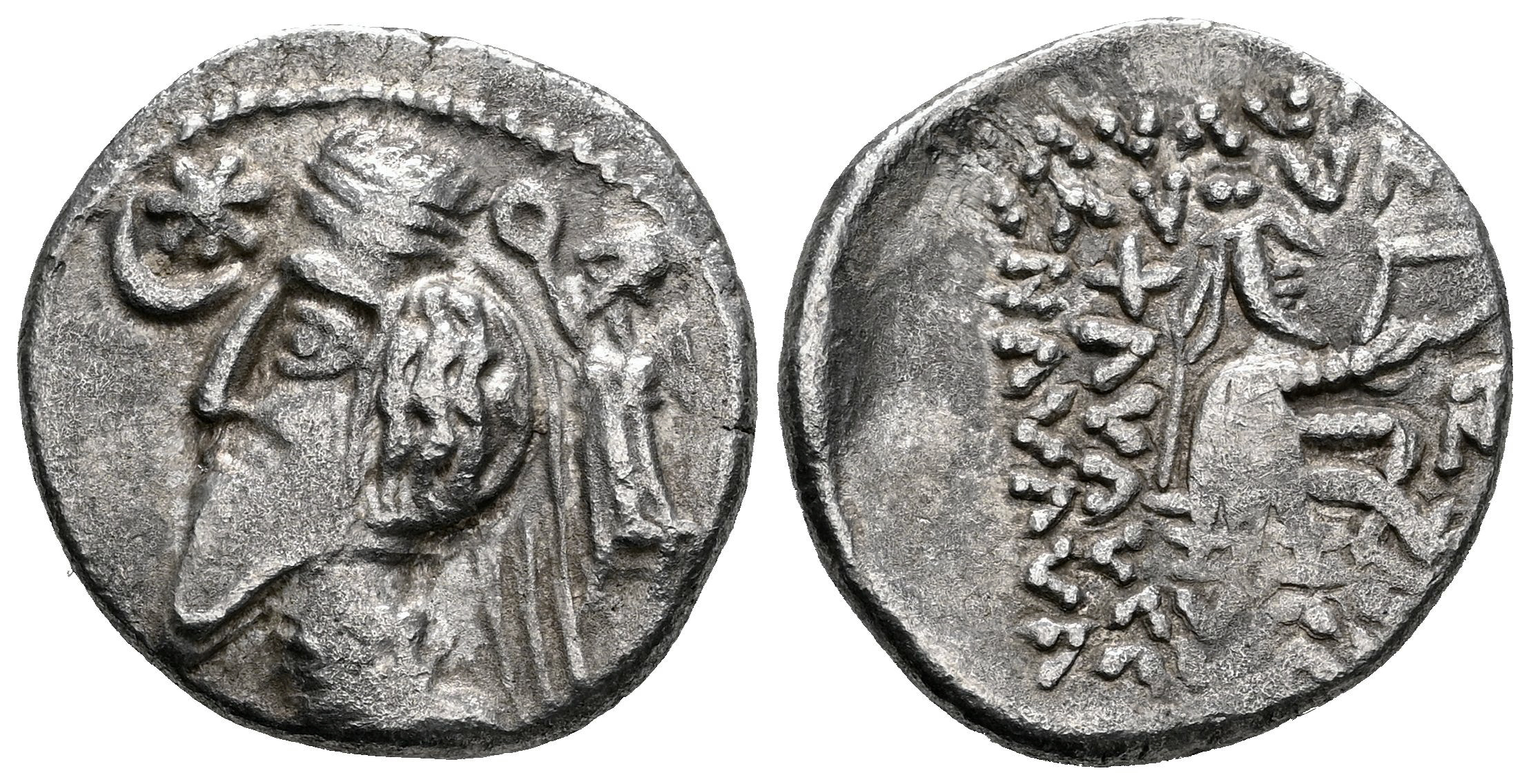 Kingdom of Parthia. Phraatakes. Drachm. 2 BC - 4/5 AD. Mithradatkart. (Sellwood-56.7). (Sunrise-400 var.). Anv.: Diademed and bust to left; star within crescent before, Nike crowning him with wreath behind. Rev.: Archer (Arsakes I) seated to right on throne, holding bow; star behind, monogram below bow, blundered legend around. Ag. 3,49 g. Rare. Almost VF. Est...80,00.