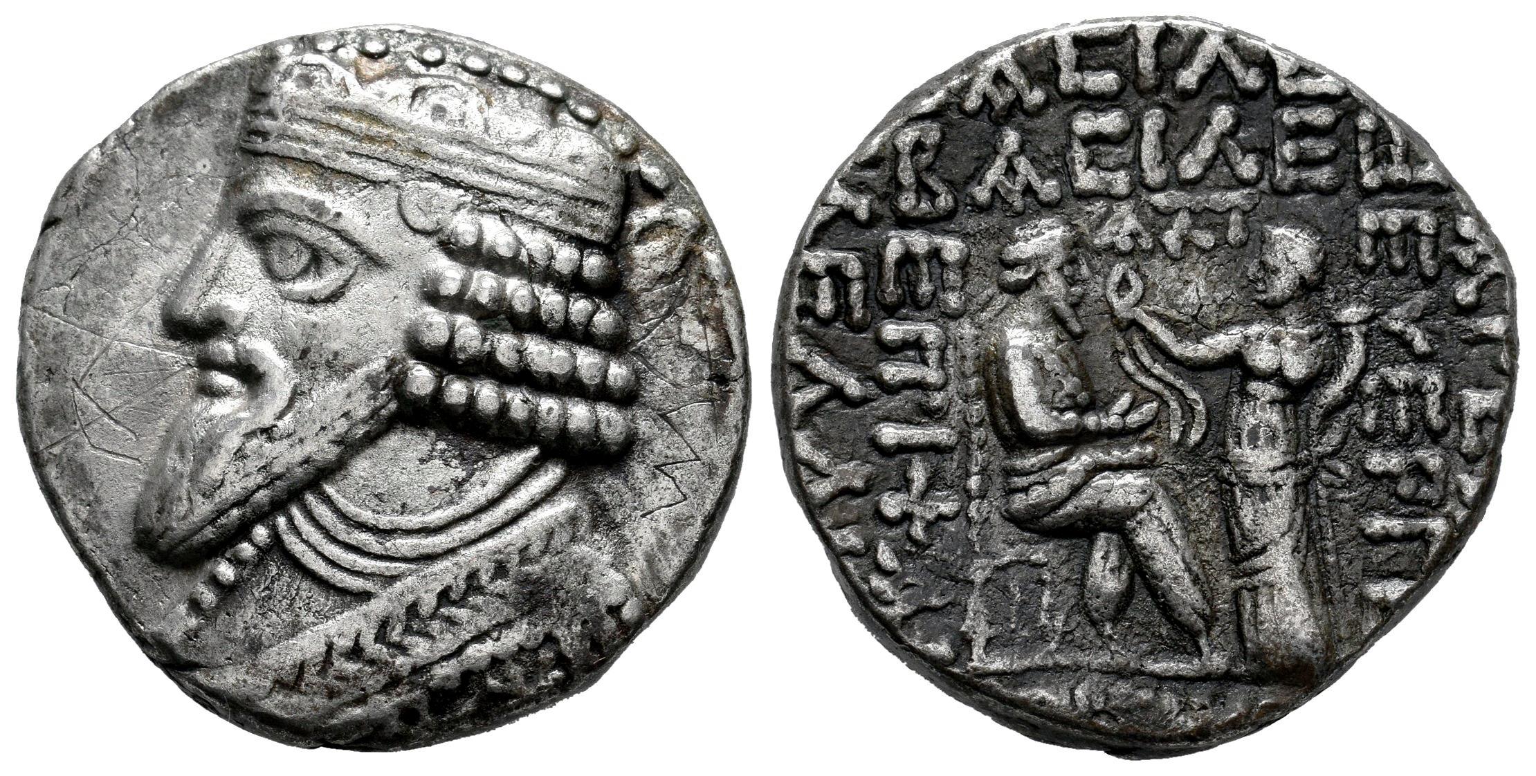 Kingdom of Parthia. Gotarzes II. Tetradrachm. SE 361 = 50 AD. Seleukeia on the Tigris. (Sellwood-65.25/7). (Shore-362). Anv.: Diademed and draped bust to left. Rev.: Tyche standing to left, holding cornucopiae and wreath held out to Gotarzes seated to right on throne; AΞT (year) above, [month] in exergue. Ag. 14,58 g. A good sample. Choice VF. Est...200,00.
