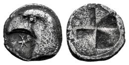 Aeolis. Kyme. Hemiobol. 450-400 BC. (Sng Cop-31). (Sng Kayhan-786). Anv.: Head of eagle to left; star below beak. Rev.: Quadripartite incuse square. Ag. 0,35 g. Choice VF/VF. Est...90,00.